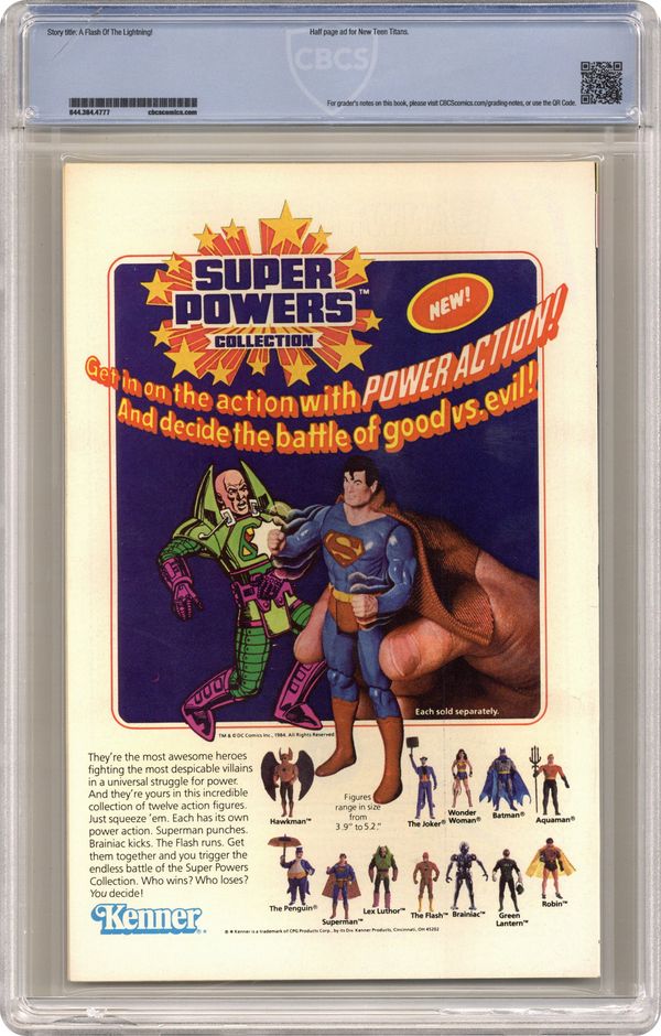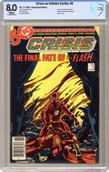Direct Edition. "A Flash of the Lightning!" Written by Marv Wolfman. Art by George Perez and Jerry Ordway. Fresh off his set-back of last issue, the nefarious Anti-Monitor is reborn and he's more powerful and more determined than ever to destroy all life in the multiverse. As this sinister villain threatens to destroy all life in the positive universe, the only one left to stop him is the Flash, but at what cost. Don't miss one of the most heroic moments in the history of this medium as the Scarlet Speedster sacrifices all to preserve life in the DCU. Featuring the heroic death of the Flash (Barry Allen). NOTE: This was a character defining moment that can still be felt in the Post-Crisis DCU today. - Odinson, Lone Star Comics Archivist Cover price $0.75. Grade: CBCS 8.0 explanation of grade Condition: Used (collectible)