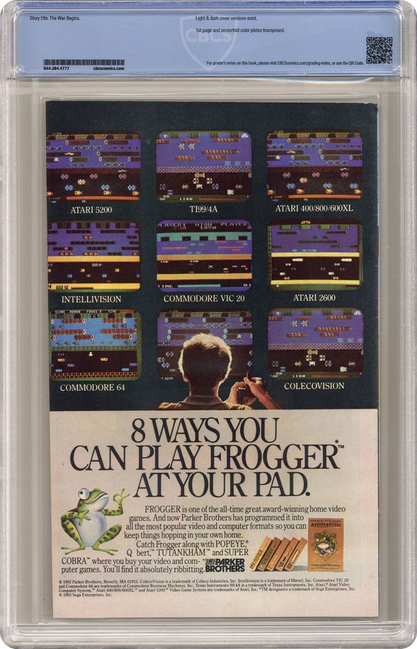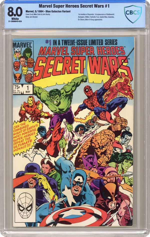 Direct Edition. "The War Begins!" Part 1 of 12. Story by Jim Shooter. Art by Mike Zeck and John Beatty. This is it, the granddaddy of all epic events. Before Identity Crisis, Infinite Crisis, House of M, Civil War, and Infinity Gauntlet there was Secret Wars. A nigh omnipotent being from beyond has, for lack of a better word, kidnapped the greatest heroes and deadliest villains in the Marvel Universe and whisked them to the far side of the universe to battle for the ultimate prize. One thing is for certain, the lives of these heroes and villains will never be the same again. - This is the first printing. Any 2nd printing will have the words "Second Printing" at the bottom of the first page. NOTE: Nearly all first printings contain a "Blue Galactus" from a printing error (a lack of magenta printing plates) that was corrected in later printings. While small number of First printings may have the correct colors, the majority of copies will have "Blue Galactus". Due to the frequency, "Blue Galactus" variants should be treated the same as other First Printings. 36 pages, full color. Cover price $0.75. Grade: CBCS 8.0 explanation of grade Condition: Used (collectible)