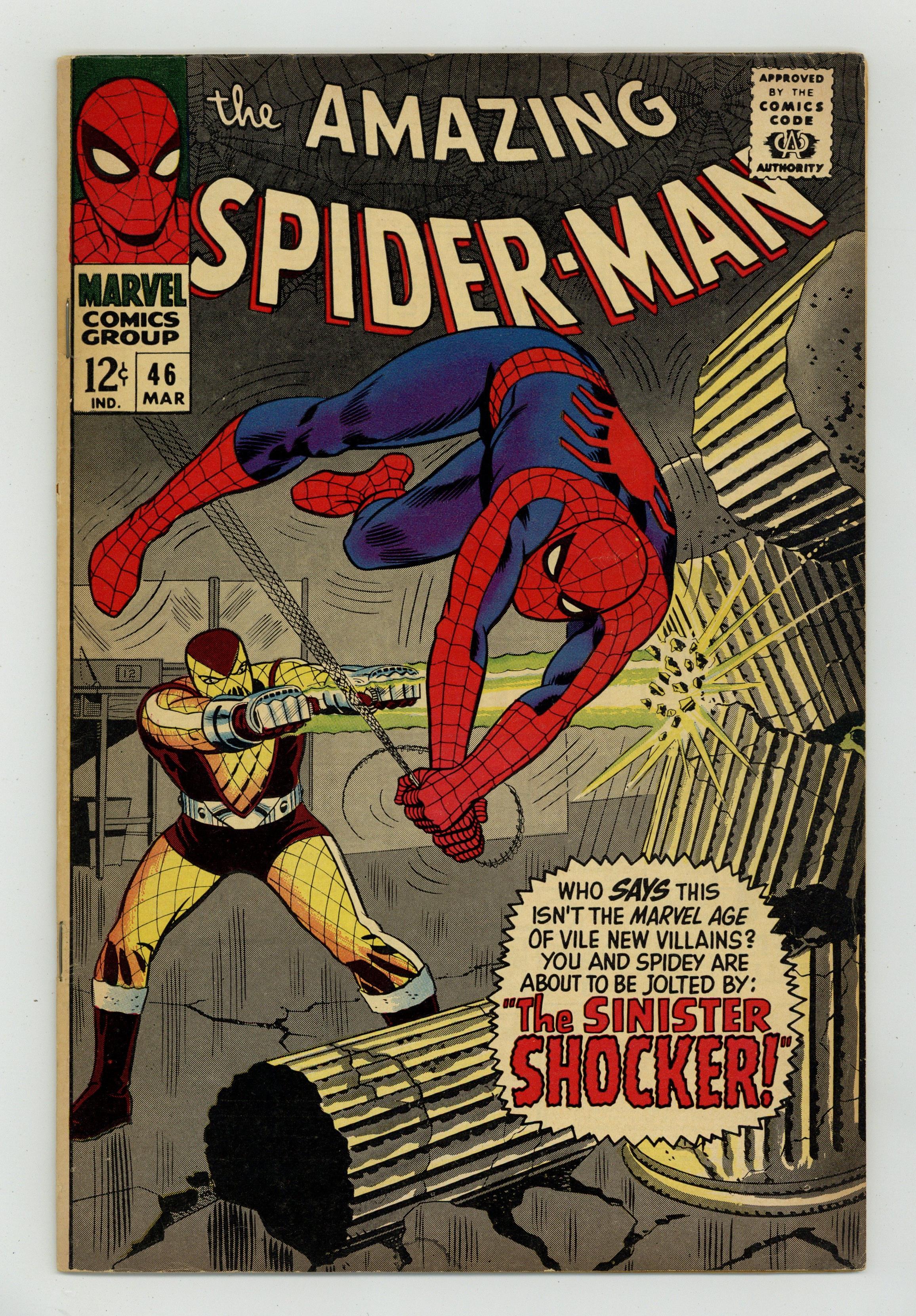 Cover by John Romita Sr.. First appearance of the Shocker in "The Sinister Shocker," script by Stan Lee, art by John Romita Sr.; Peter moves in with Harry and is confronted by the Shocker for the first time; Shocker brutalizes Spider-Man, but the Webslinger defeats him with his webs; once at Harrys, Peter doesn't feel happy, although he doesn't know why. Reprinted in Marvel Tales # 186. 36 pgs., full color. $0.12. Cover price $0.12. Grade: VG- 3.5 explanation of grade Condition: Used (collectible)
