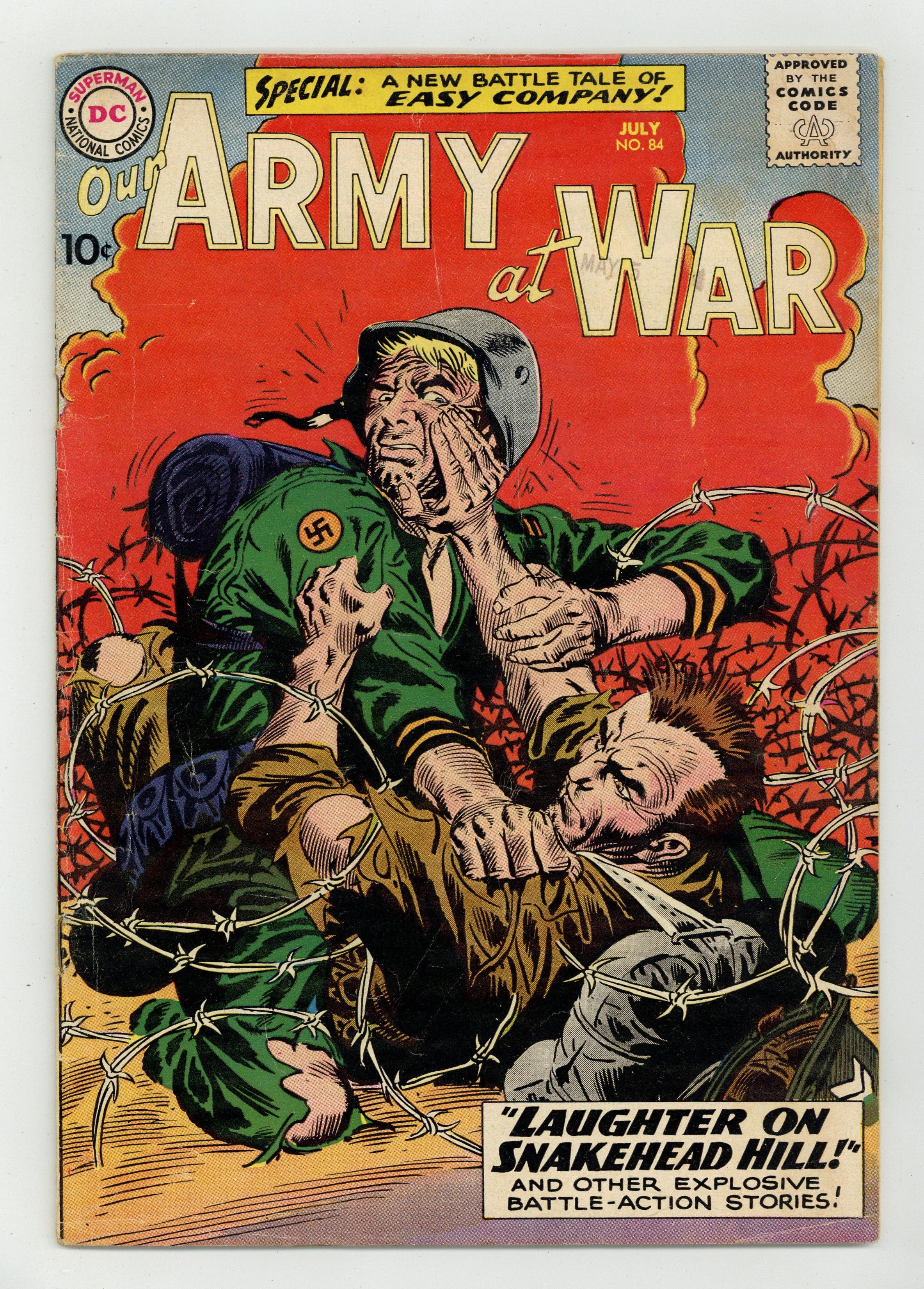 Cover art by Joe Kubert. Laughter on Snakehead Hill! starring Sgt. Rock, script by Bob Kanigher, art by Irv Novick. Lucky Seventh - Battle Story of the 7th Armored Division. Flameout, script by Hank Chapman, pencils by Ross Andru, inks by Mike Esposito. Star Spangled War Stories #82 ad. Cleared to Combat, script by Bob Haney, pencils by Bob Forgione, inks by Jack Abel. 36 Pages, Full Color. Cover price $0.10. Grade: GD- 1.8 explanation of grade Condition: Used (collectible)