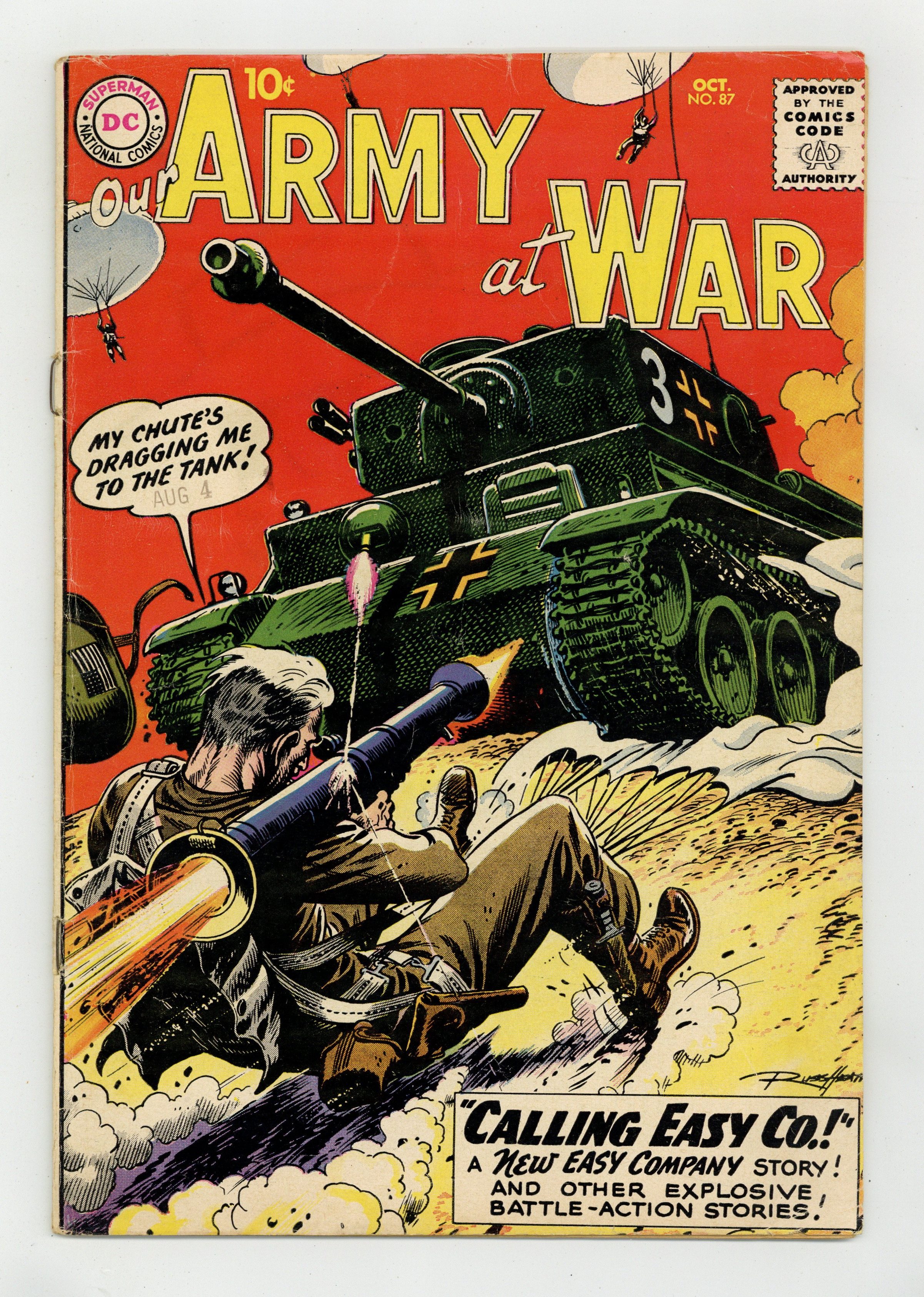 Cover art by Russ Heath. Calling Easy Co.! starring Sgt Rock, script by Bob Kanigher, art by Joe Kubert. Tiger Twister, script by Bob Haney, art by Mort Drucker. Worm's-Eye War, script by Bob Haney, art by Russ Heath. 36 Pages, Full Color. Cover price $0.10. Grade: VG 4.0 explanation of grade Condition: Used (collectible)