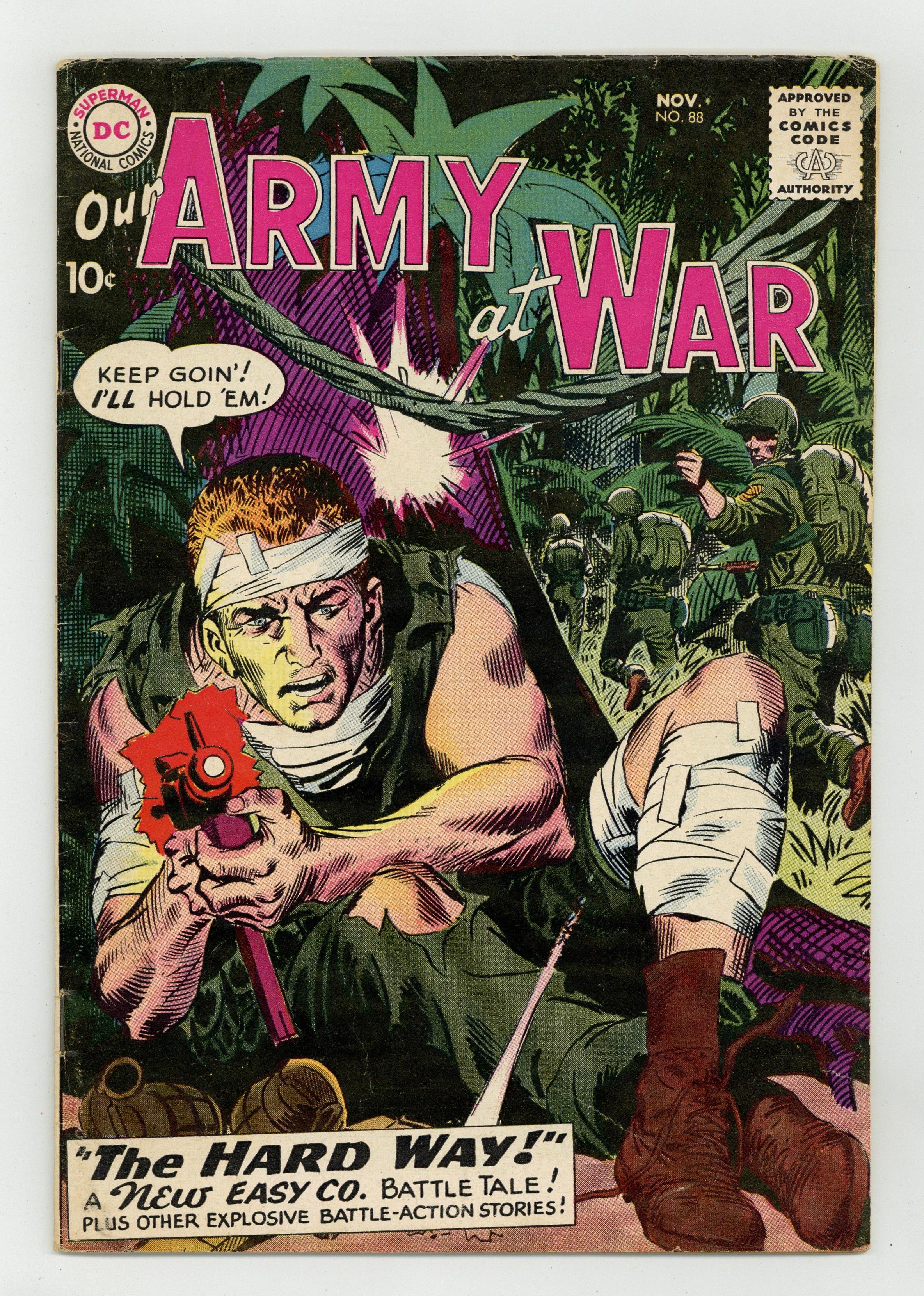 Cover art by Joe Kubert. The Hard Way! starring Sgt. Rock, script by Bob Kanigher, art by Jerry Grandenetti. Frogman Anchor Jockey, script by Bob Haney, art by Jack Abel. A Sarge is 10 Feet Tall, script by Bob Haney, art by Russ Heath. 36 Pages, Full Color. Cover price $0.10. Grade: VG+ 4.5 explanation of grade Condition: Used (collectible)