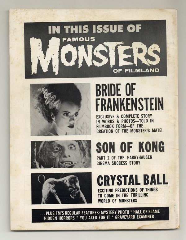 Ended Mar 14 2024 Winning Bid $37 Features in this issue include: part two of "Son of Kong"; an article about the Route 66 monster episode; a brief bio of Dwight Frye; a photo essay and synopsis of The Bride of Frankenstein; and more. The cover depicting Frankenstein and his Bride is a photo that has been retouched in color by Basil Gogos. Cover price $0.50. Grade: GD+ 2.5 explanation of grade Condition: Used (collectible)
