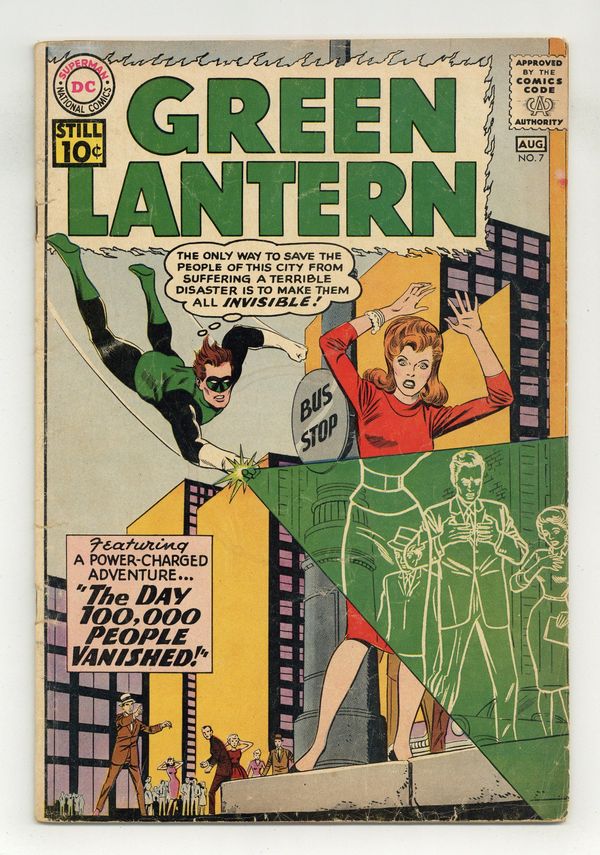 Origin and first appearance of Sinestro. Cover pencils by Gil Kane, inks by Joe Giella. The Day 100,000 People Vanished!, script by John Broome, pencils by Gil Kane, inks by Joe Giella; In an attempt to capture Green Lantern, Sinestro captures 100,000 people from the town of Valdale; The Guardians warn Green Lantern of Sinestro's plan and Green Lantern travels to Qward to rescue the citizens of Valdale. Wings of Destiny!, script by John Broome, pencils by Gil Kane, inks by Joe Giella; Green Lantern accidentally changes Pieface into a bird while Green Lantern is having a dream. Later Green Lantern has to meet Terga at the airport and stop a hijacking. 36 pgs. $0.10. Cover price $0.10. Grade: GD 2.0 explanation of grade Condition: Used (collectible)