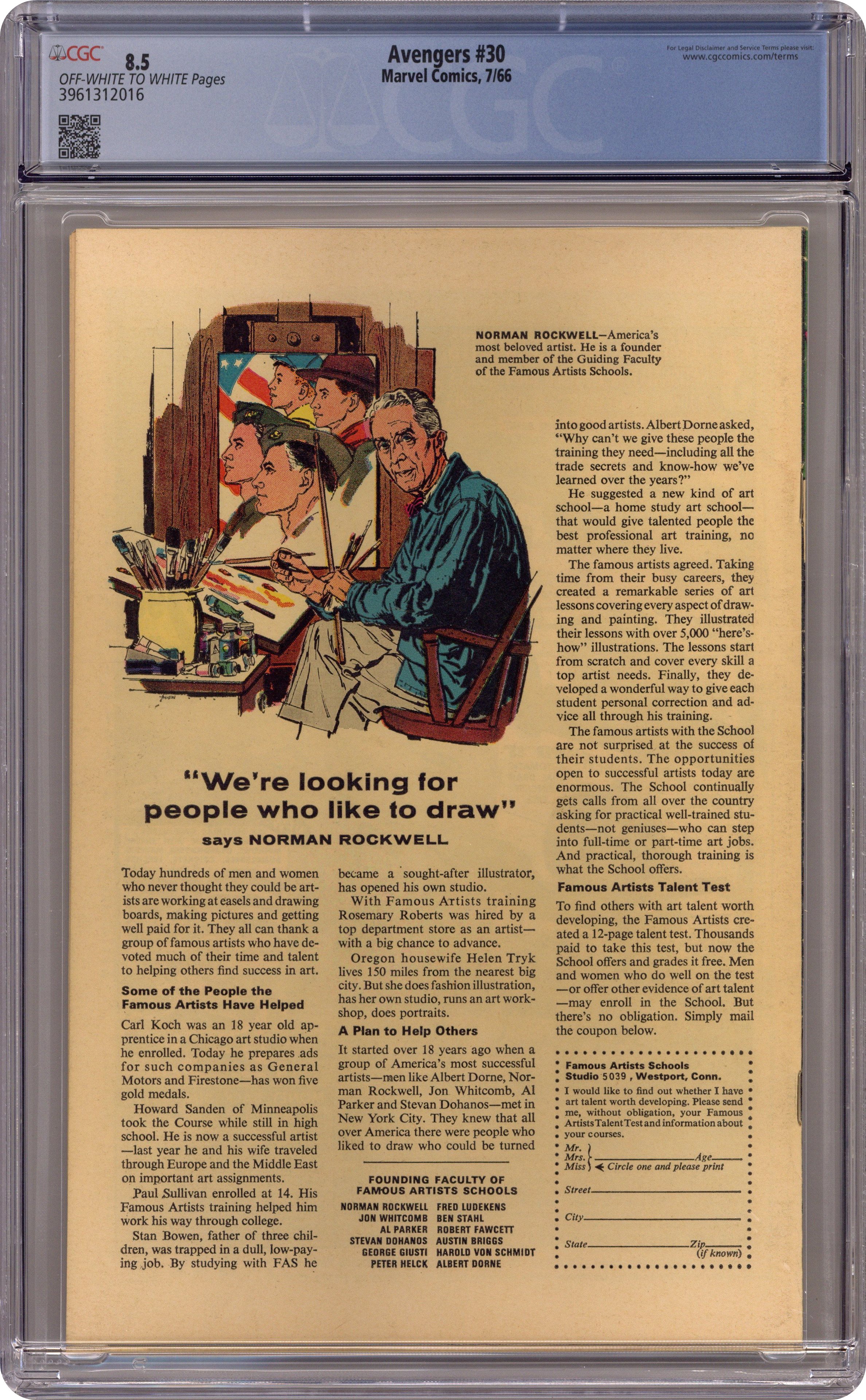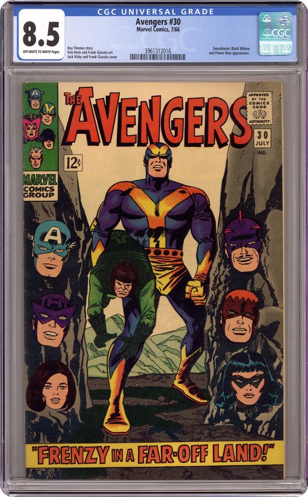 Cover pencils by Jack Kirby, inks by Frank Giacoia. "Frenzy in a Far-Off Land," script by Stan Lee, pencils by Don Heck, inks by Frank Giacoia; Quicksilver and the Scarlet Witch take a leave of absence from the Avengers due to their dwindling powers; Goliath also sets off to South America to try and find a cure, hearing his old college professor Dr. Anton is there; Black Widow is ordered to destroy the Avengers again with the help of the Swordsman and Power Man; The Avengers find the Black Widow and co. but Hawkeye wants to go alone, as it is personal to him; Meanwhile, Goliath lands in South America and finds Dr. Anton has been captured by the Keeper of the Flame; He tries to save him, but is overwhelmed then brought to safety by Prince Rey, who leads a rebel force against the Keeper; Hawkeye defeats the Swordsman but is trapped by Power Man; The Black Widow saves him, finding herself unable to harm Hawkeye as she loves him; Captain America and the Wasp leave to help Goliath. Avengers roll call: Captain America, Hawkeye, Goliath, the Wasp, and, briefly, Quicksilver and the Scarlet Witch. 36 pgs., full color. $0.12. Cover price $0.12. Grade: CGC 8.5 explanation of grade Condition: Used (collectible)
