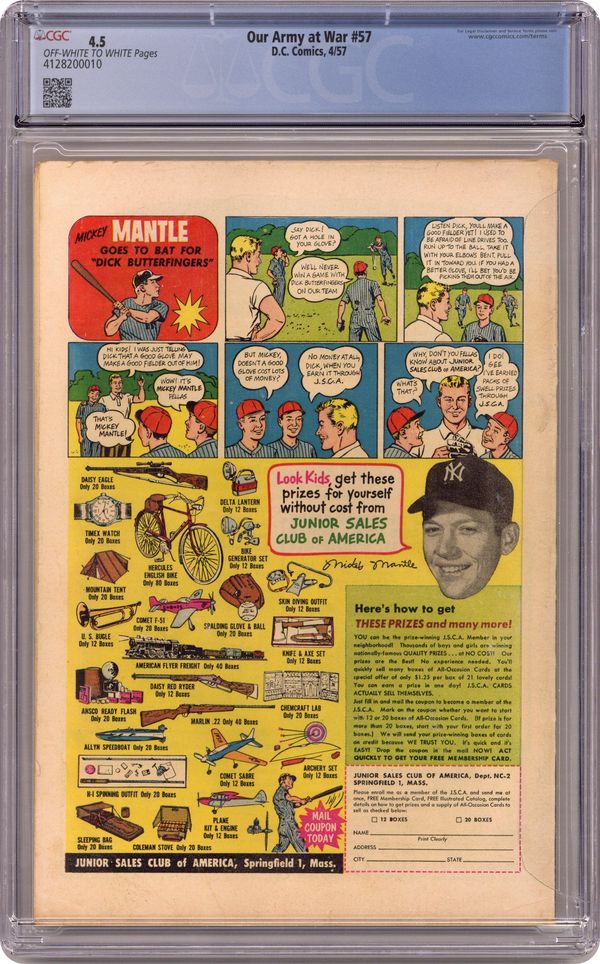 Cover art by Jerry Grandenetti. Ten-Minute Break, script by Ed (France) Herron, art by Jack Abel. The Big Eye, script by Jack Miller, art by Russ Heath. Battlefield Bow, script by Bob Kanigher, pencils by Ross Andru, inks by Mike Esposito. Untitled story, script by Bob Kanigher, art by Joe Kubert. 36 Pages, Full Color. Cover price $0.10. Grade: CGC 4.5 explanation of grade Condition: Used (collectible)