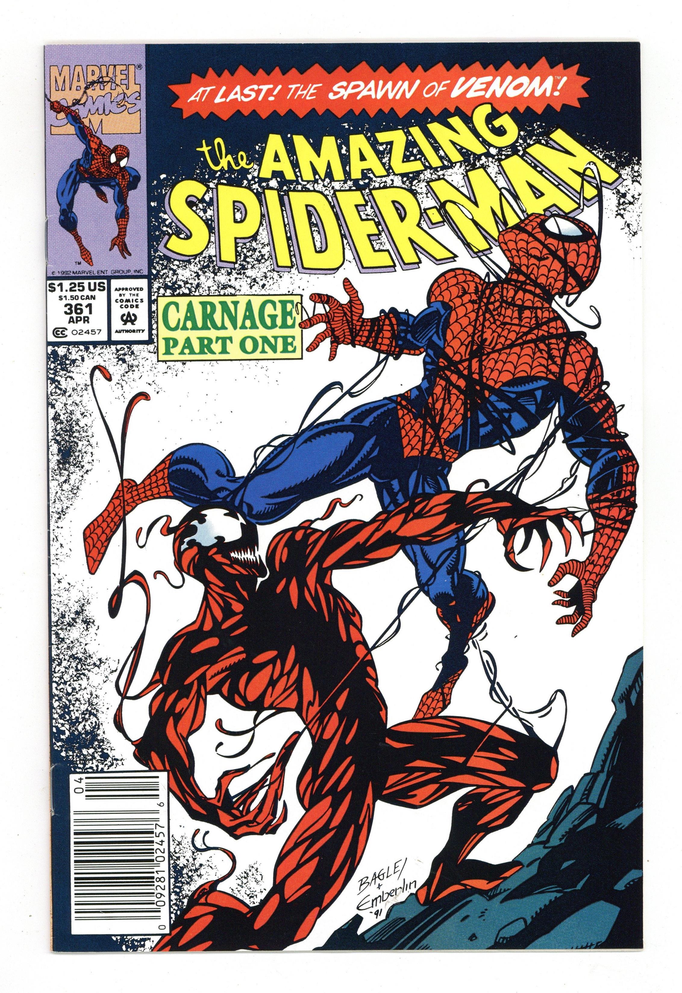 Ended Jan 19 2024 Winning Bid $105 First Printing. Newsstand Edition. First (full) appearance of Carnage in "Savage Genesis!" Part 1 of 3. Script by David Michelinie. Pencils by Mark Bagley. Inks by Randy Emberlin. Cover by Mark Bagley and Randy Emberlin. Blood runs in the streets as a serial killer roams New York City! And as the web-slinger investigates the murders, he notices a very disturbing similarity to another killer's modus operandi! In a burned-out building in Brooklyn, the spectacular one comes face-to-face with his new homicidal foe...Carnage! Can the wall-crawler end Cletus Kasady's rampage in their very first encounter? Cameo appearances by Aunt May and Mary Jane Watson. Flashback cameo by Venom. (Note: This three-part story was reprinted in 2011 in the trade paperback: Spider-Man -- The Vengeance of Venom.) 36 pages, full color. $1.25 cover price. NOTE: Most of these were distributed with slight printer tears in the bottom edge of the cover. Cover price $1.25. Grade: VF+ 8.5 explanation of grade Condition: Used (collectible)