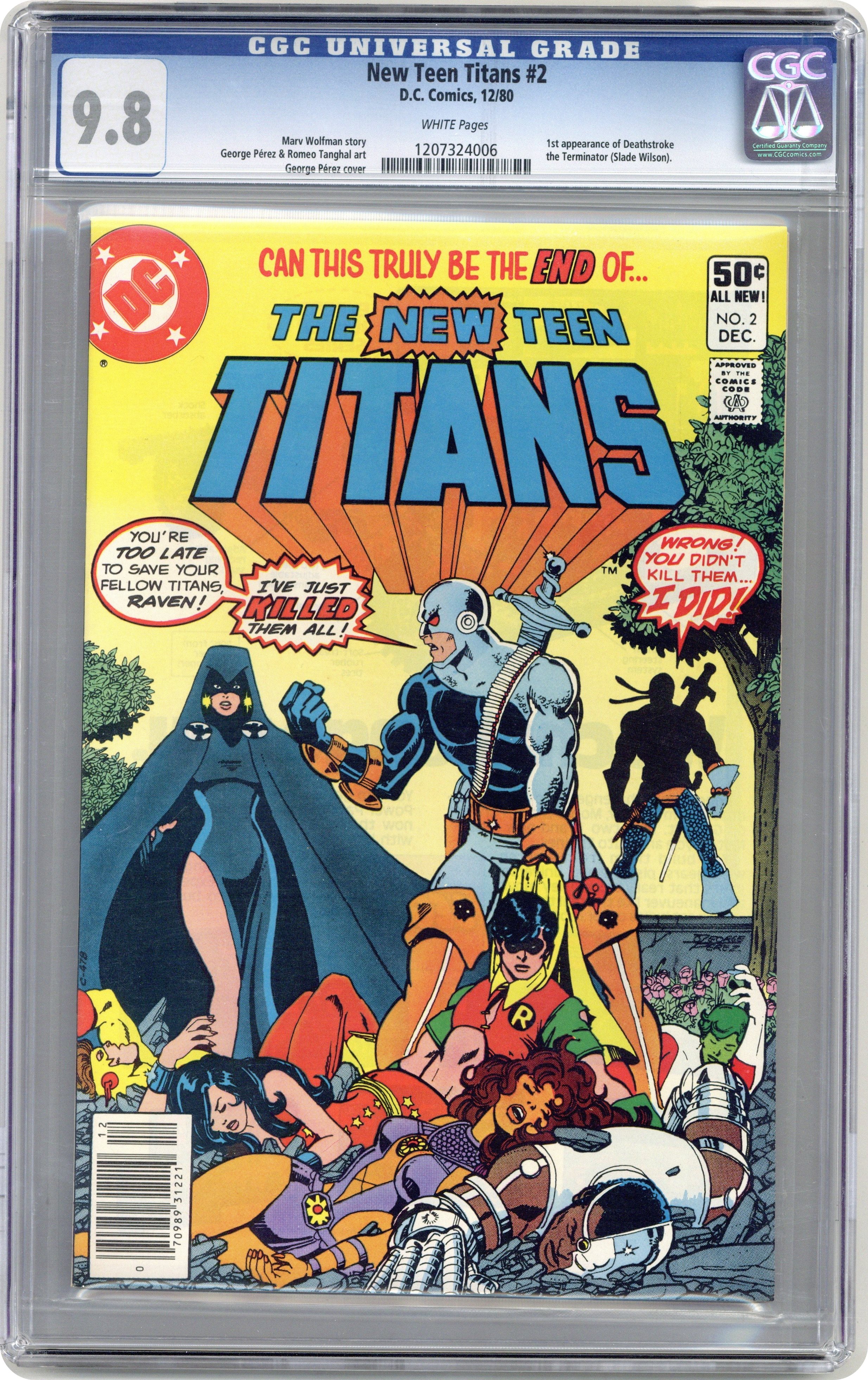 Direct Edition. First appearance of Deathstroke the Terminator in "Today...the Terminator!" Characters: Teen Titans [Robin; Kid Flash; Wonder Girl; Cyborg; Starfire; Raven; Changeling]; The Terminator [Slade Wilson] (1st; Later Deathstroke); The Ravager [Grant Wilson] (Intro; Death); Wintergreen (Intro); HIVE. Script by Marv Wolfman, with art by George Perez and Romeo Tanghal. Plus: an article by Marv Wolfman on the revival of the Teen Titans. Cover by George Perez. Cover price $0.50. Grade: CGC 9.8 explanation of grade Condition: Used (collectible)