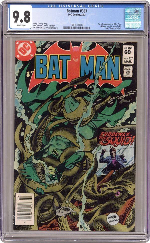 1st printing. Direct Edition. 1st appearance of Jason Todd and Killer Croc (cameo). Cover pencils by Ed Hannigan, inks by Dick Giordano. "Squid" starring Batman, Dick Grayson, Commissioner Gordon, Hamilton Hill, Joey Taylor, Waldo Flynn, Olivia Ortega, and the Squid (first appearance), script by Gerry Conway, pencils by Don Newton, inks by Alfredo Alcala; The Squid comes to Gotham City to launch a takeover of its underworld, and to trap the Batman; A mobster offering crooked protection threatens a circus owner; Refusing to give in, the owner unwittingly puts a target on the heads of his star performers, a husband and wife trapeze act; Days later, a young boy discoveres that his parents had been brutally murdered. Taken in by the sympathetic millionaire Bruce Wayne (Batman) the boy trains and becomes his new mentor's sidekick as Robin, the boy wonder; Not Dick Grayson, though--This time it was the copycat story of Jason Todd, the second person to become Robin. Story continues in the pages of Detective Comics (1937 1st Series) #524. Letter to the editor from comics editor/writer Kevin Dooley. 40 Pages, Full Color. Cover price $0.60. Grade: CGC 9.8 explanation of grade Condition: Used (collectible)