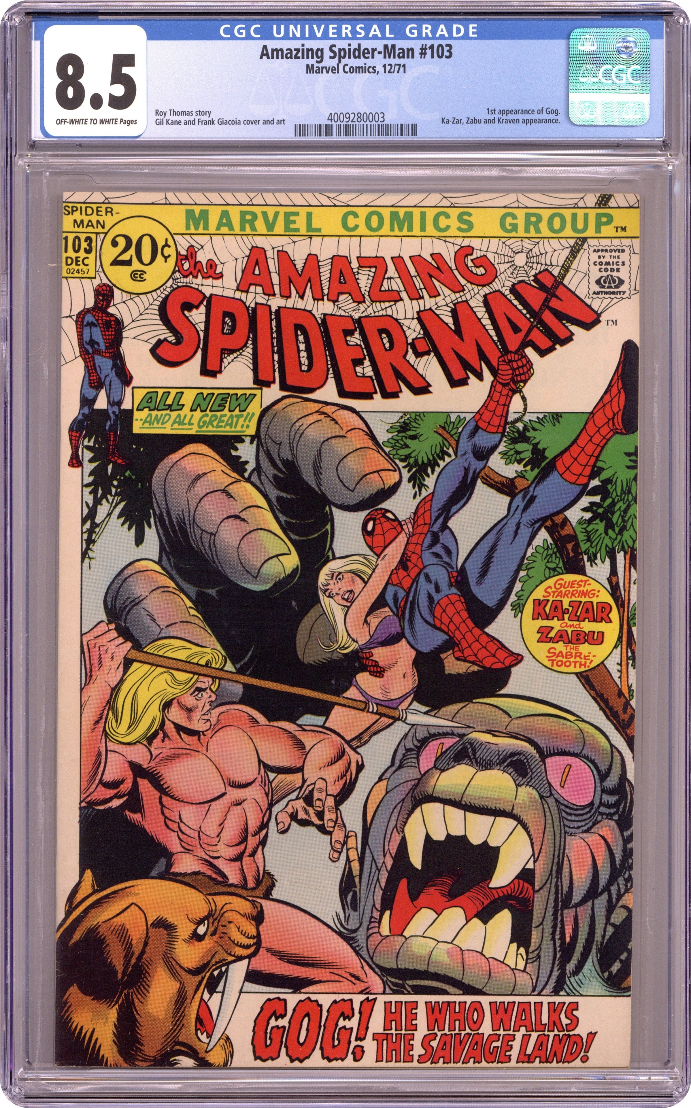 Ended Jan 21 2024 Winning Bid $76 "Walk the Savage Land!" Part 1 of 2. Guest-starring Ka-Zar. Script by Roy Thomas. Pencils by Gil Kane. Inks by Frank Giacoia. Cover by Gil Kane and Frank Giacoia. Spider-Man and Gwen Stacy in the Savage Land with Ka-Zar!What a cover preview! But how did they get there? The story begins a few days earlier when J. Jonah Jameson -- upset about the Daily Bugle's declining circulation numbers -- hears a tale about a mysterious monster in the Savage Land. Jonah immediately orders an in-depth feature on Ka-Zar'shidden jungle to boost the Bugle's sales! And he will lead the expedition to Antarctica himself! However the Savage Land is fraught with danger. Shortly after the group arrives, the gigantic monster called Gog grabs Gwen!And the web-slinger will move heaven and earth...and anything else in the Savage Land...to get her back! Cameo appearances by Joe Robertson, Zabu, and Kraven the Hunter. First 20ยข cover price. (Notes: Ka-Zar and the web-slinger first met in Amazing Spider-Man #57. This issue was reprinted in Marvel Tales #81 and #82.) 36 pages. Cover price $0.20. Grade: CGC 8.5 explanation of grade Condition: Used (collectible)