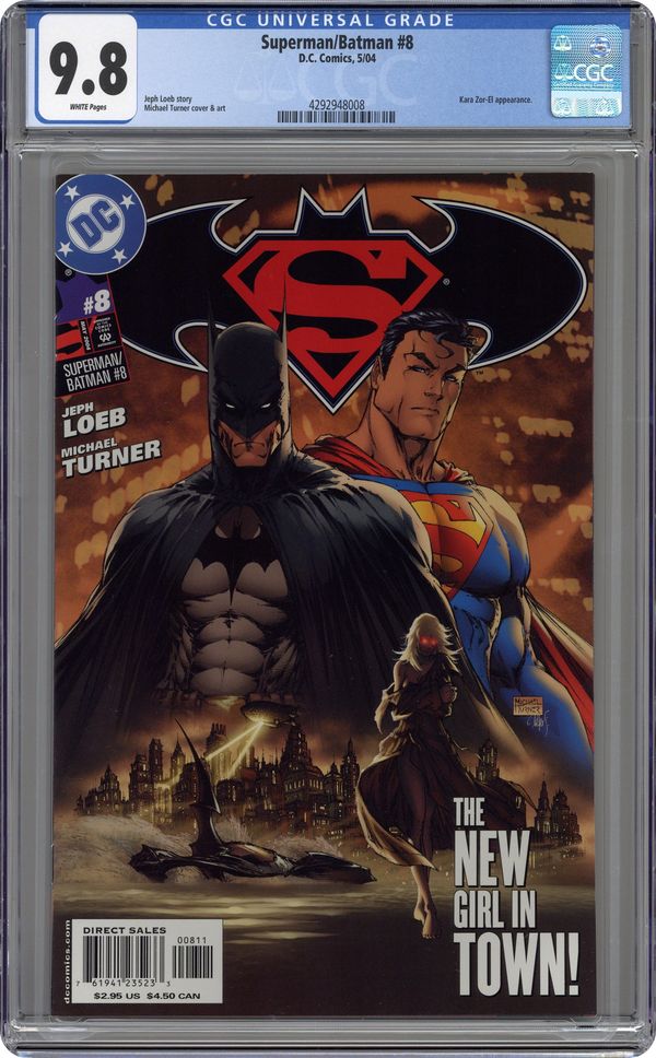1ST PRINTING (full-color cover, red Superman logo.). Kara Zor-el appearance. WRITTEN BY JEPH LOEB; ART AND COVER BY MICHAEL TURNER Part one of the Supergirl from Krypton, an explosive 6-part storyline featuring art by Aspen Studios' Michael Turner begins here! After the catacylsmic events of SUPERMAN/BATMAN #6, Batman discovers something strange and mysterious on the bottom of Gotham Bay...and it looks like a girl. Will she battle on the side of good...or evil? FC, 32 PG. $2.95 Cover price $2.95. Grade: CGC 9.8 explanation of grade Condition: Used (collectible)