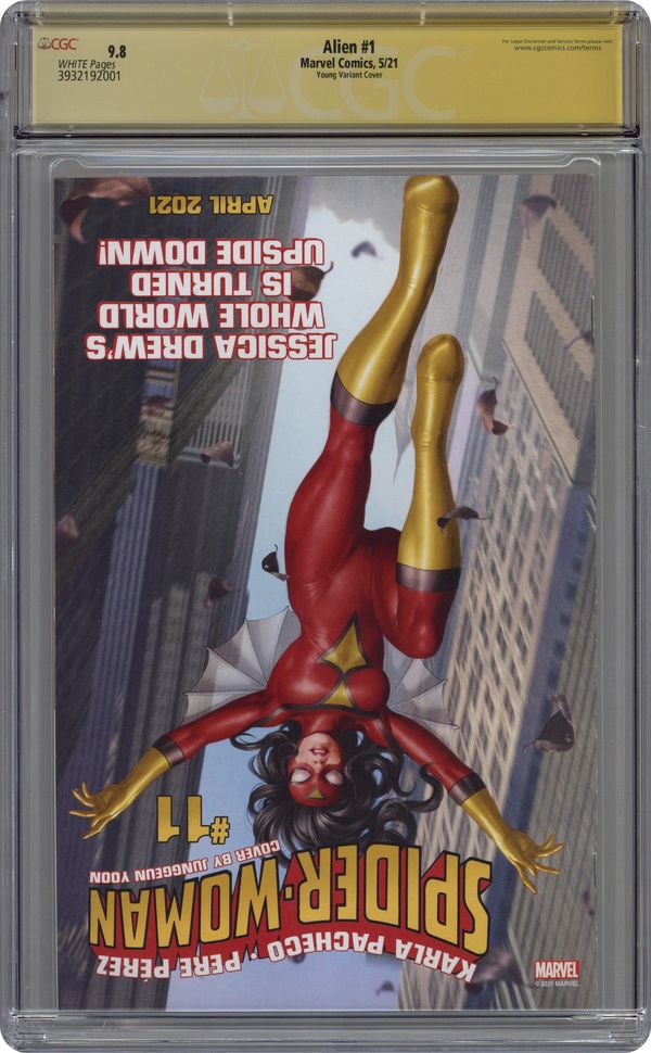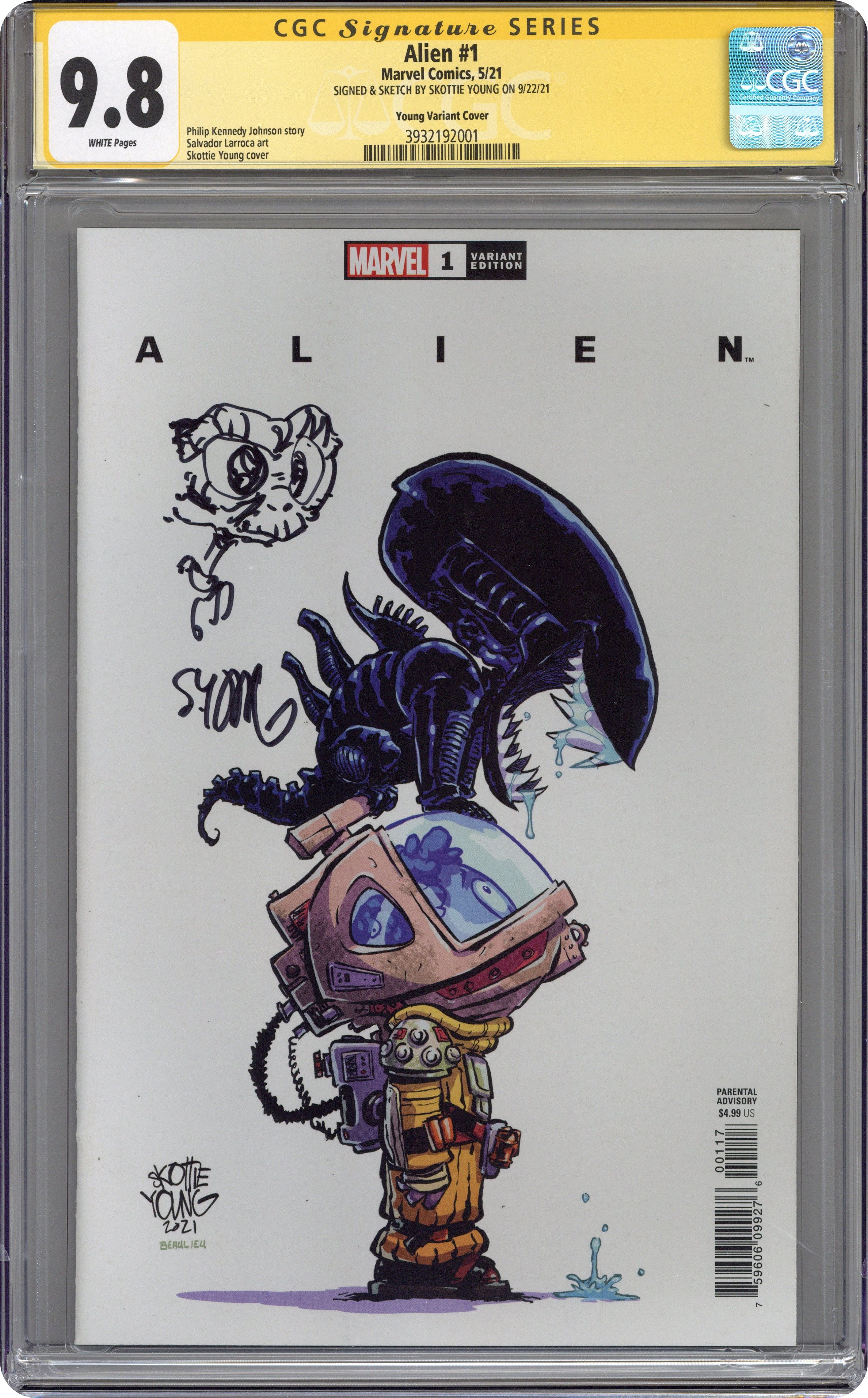 Written by Phillip Kennedy Johnson. Art by Salvador Larroca. Cover by Skottie Young. THE ICONIC CINEMATIC TERROR MAKES ITS MARVEL DEBUT! Gabriel Cruz gave his life to Weyland-Yutani--In the case of an alien attack he barely survived, almost literally! Recently retired, Cruz is trying to patch things up with his abandoned son with the help of his friend, a Bishop-model android, but his re-entry into civilian life is not going smoothly…and his encounters with the deadly Xenomorph are far from over. Phillip Kennedy Johnson and Salvador Larroca team up to tell an all-new tale of the titan of horror and science fiction that has scared audiences for decades. No one is safe. No one is innocent. And no one can hear you scream. 40 pages, full color. Parental Advisory Cover price $4.99. Grade: CGC 9.8 explanation of grade Condition: Used (collectible)