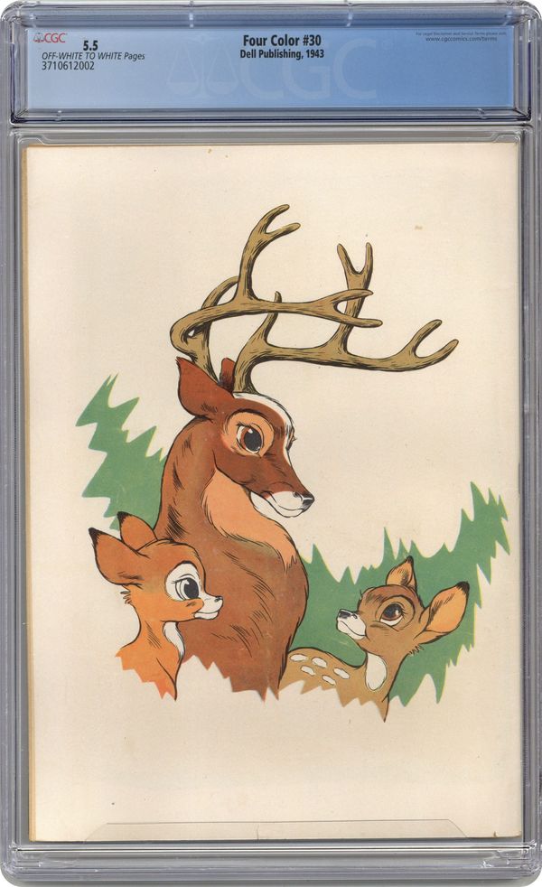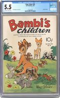 Ended Jan 18 2024 Winning Bid $106 Indicia title is "BAMBI'S CHILDREN, No. 30." Cover art by Ken Hultgren. Bambi's Children, script by Felix Salten (original story), art by Ken Hultgren; The adventures of the children of Bambi and Faline (Gino and Gurri), Thumper (Hopper and Patter), and Flower (Buttercup and Primrose). Map of the Forest filler page, art by Ken Hultgren. Back cover portrait-style illustration of Bambi with his children Geno and Gurri, art by Ken Hultgren. 60 pages, full color. Cover price $0.10. Grade: CGC 5.5 explanation of grade Condition: Used (collectible)
