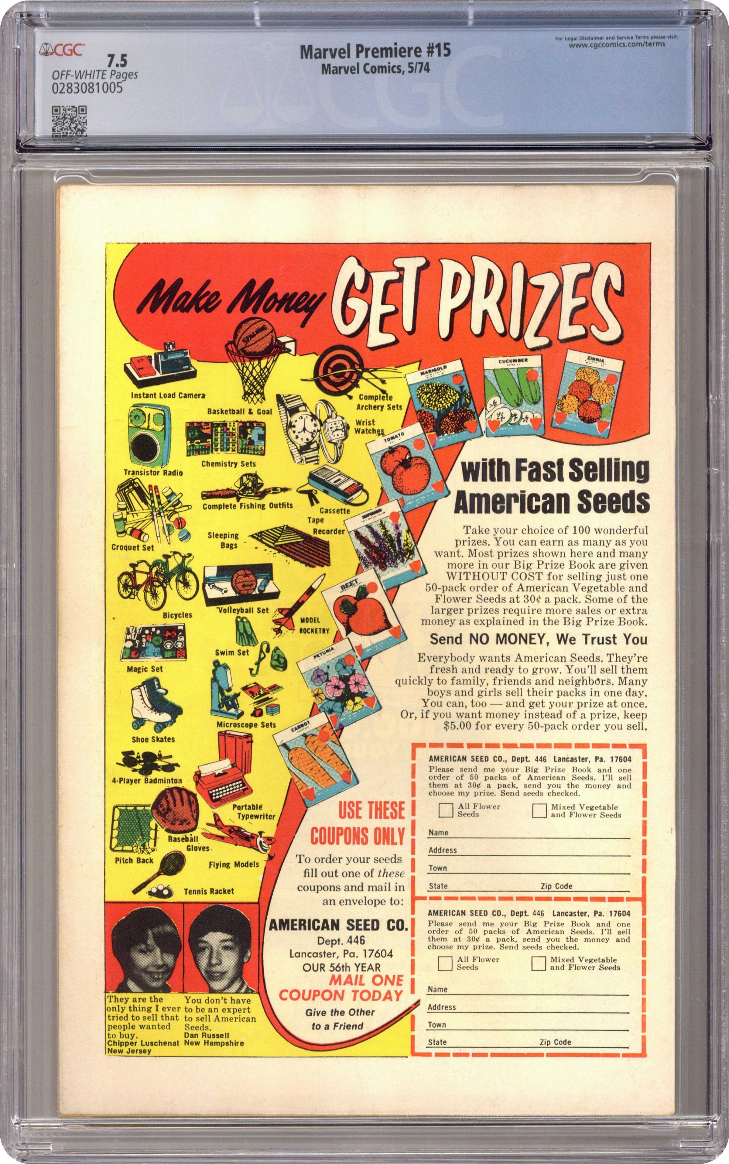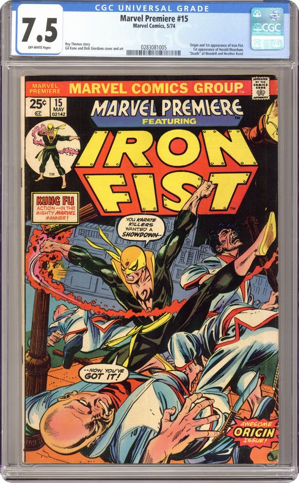 Ended Jan 25 2024 Winning Bid $205 First 25-cent cover price. Origin and first appearance of Iron Fist in The Fury of Iron Fist!, script by Roy Thomas, pencils by Gil Kane, inks by Dick Giordano; Iron Fist passes the final tests in his K'un-Lun training and is granted the privilege of immortality if he so chooses; During his final battle with the robot Shu-Hu, Danny remembers how his father was killed by Meachum and his mother gave her life to save his as the Rand family searched for the fabled city of K'un-Lun. The letters page contains Marvel Value Stamp series A # 94 (Electro by Steve Ditko). Text article explaining price hike to 25 cents for Marvel's 36-page comics, followed by short editorial by Roy Thomas detailing genesis of Iron Fist. 36 pgs. $0.25. Cover price $0.25. Grade: CGC 7.5 explanation of grade Condition: Used (collectible)