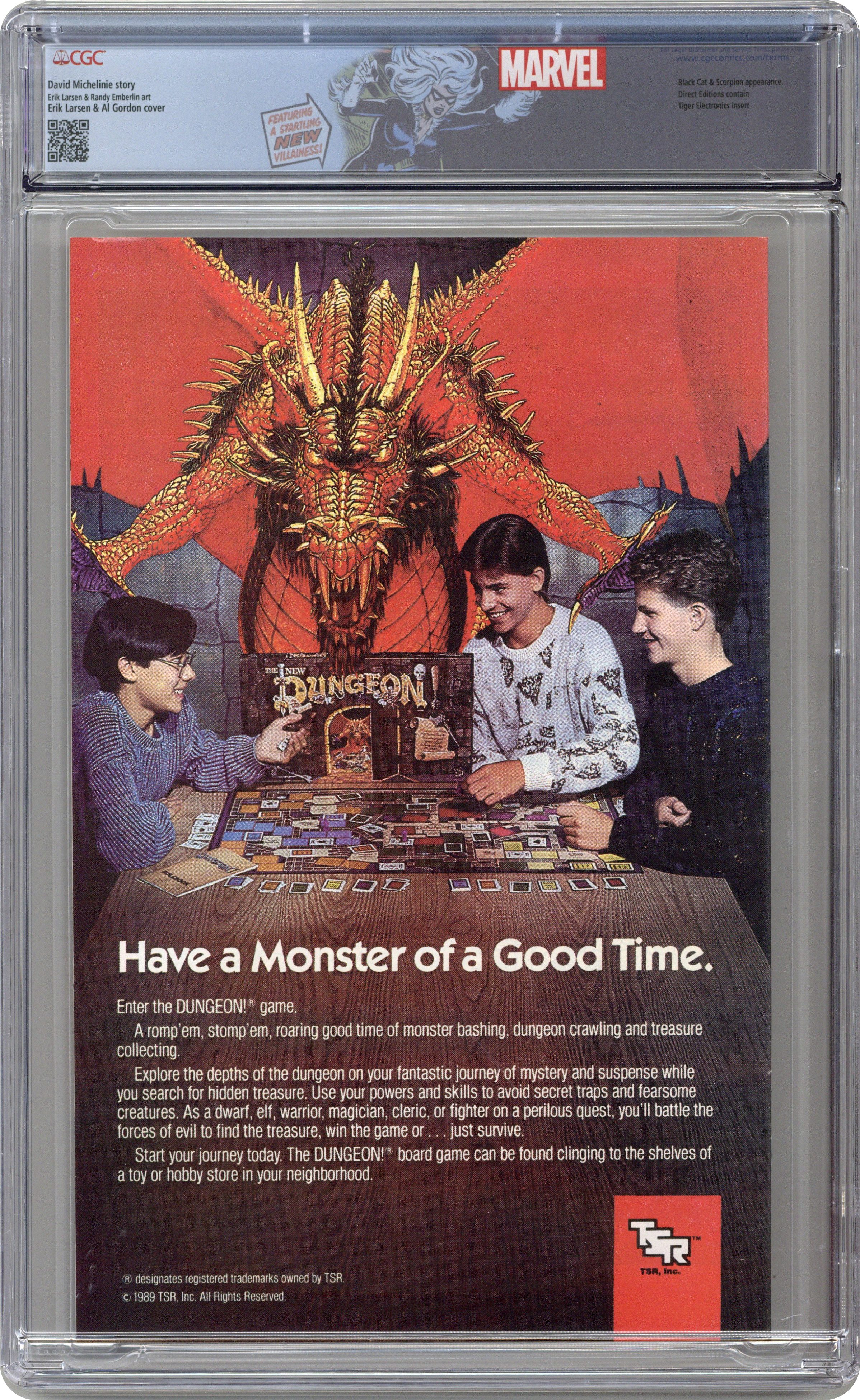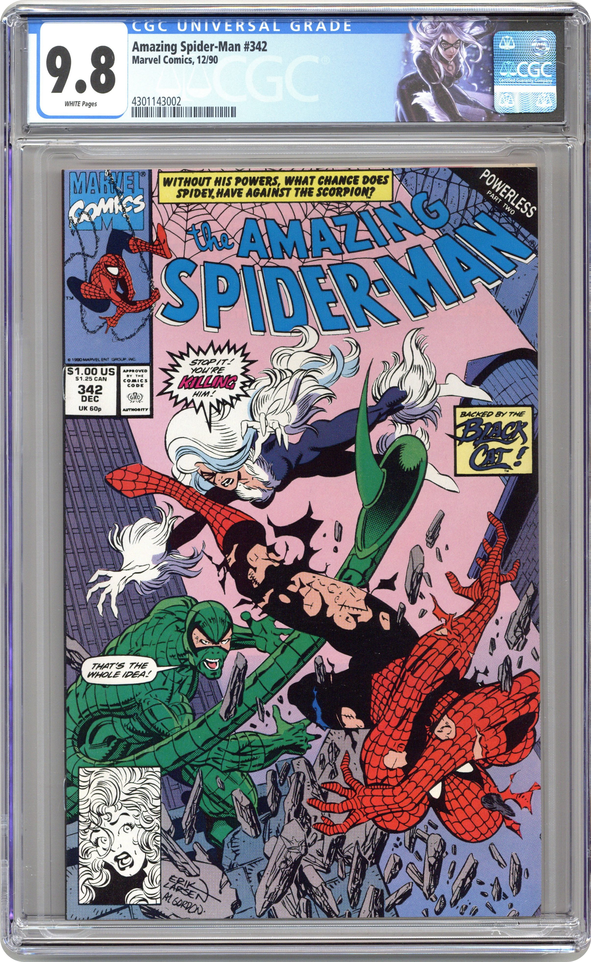 Ended Dec 12 2023 Winning Bid $70 Direct Edition. "The Jonah Trade" Powerless Part 2 of 3. Script by David Michelinie. Pencils by Erik Larsen. Inks by Randy Emberlin. Cover by Erik Larsen and Al Gordon. Last issue the powerless web-slinger got by with a little help from his friends! But that was against the Tarantula! Next up: the Scorpion! Yikes! Similar to the Tarantula's modus operandi, the pointy-tailed villain takes a hostage (in this instance J. Jonah Jameson) and demands a swap for the wondrous wall-crawler! And again, like last issue, the powerless Spider-Man makes a call for assistance...to the Black Cat! Will Felicia rush to the aid of her former boyfriend one more time? And what does Mary Jane think about all this? It doesn't matter now, because the Scorpion can't wait! First appearance of Dr. Elias Wirtham (aka Cardiac). Cameo appearances by Aunt May and the Chameleon. 40 pages. $1.00 cover price. Cover price $1.00. Grade: CGC 9.8 explanation of grade Condition: Used (collectible)