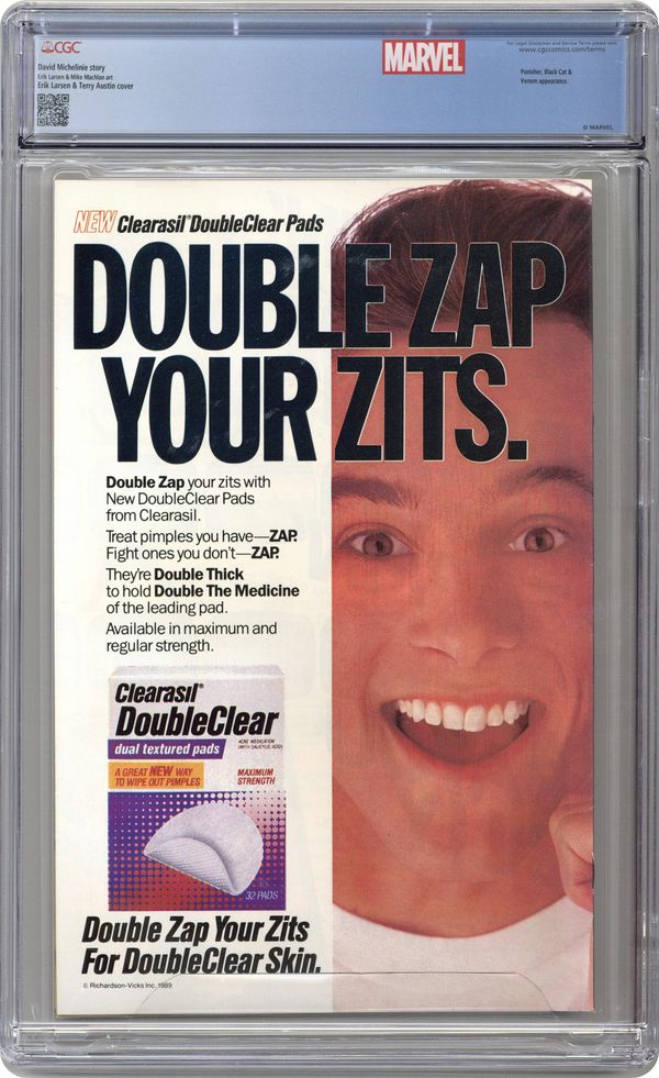 Ended Dec 5 2023 Winning Bid $68 Direct Edition. "The Death Standard" Part 2 of 2. Guest-starring the Punisher. Script by David Michelinie. Pencils by Erik Larsen. Inks by Mike Machlan. Cover by Erik Larsen and Terry Austin. To destroy the largest cocaine stockpile in the United States, the Punisher and the wondrous wall-crawler break into a secret federal installation in upstate New York! The web-slinger can't believe the government has joined the drug trade! But the Punisher doesn't care who's doing what! He's going to obliterate those drugs or die trying! Meanwhile in Colorado, Venom escapes from the Vault again! And in Soho, the Black Cat scares Mary Jane! Big problems are looming for your friendly neighborhood Spider-Man next issue! Cameo appearance by Microchip. (Note: Spider-Man and the Punisher previously worked together in Punisher War Journal (1988 1st series) 14 & 15.) 36 pages. Cover price $1.00. Grade: CGC 9.8 explanation of grade Condition: Used (collectible)