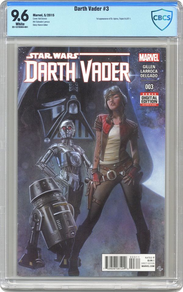 Ended Jun 24 2024 Winning Bid $82 Written by Kieron Gillen. Art by Salvador Larroca. Cover by Adi Granov. When a Dark Lord needs help, who can he turn to? Meet Aphra-the galaxy's foremost raider of lost weaponry! Plus: could these be the deadly droids she's looking for? 28 pages, full color. Rated T Cover price $3.99. Grade: CBCS 9.6 explanation of grade Condition: Used (collectible)