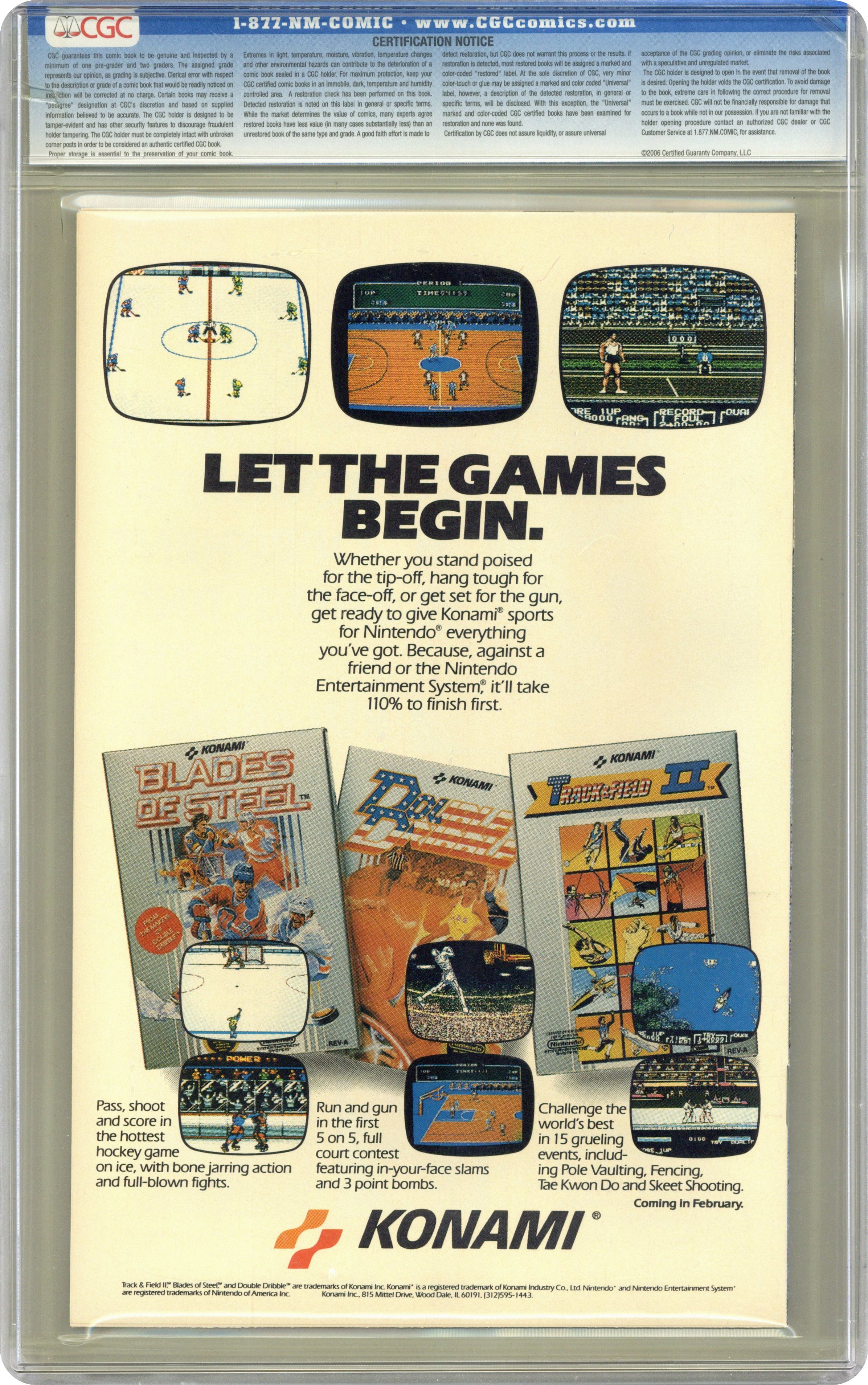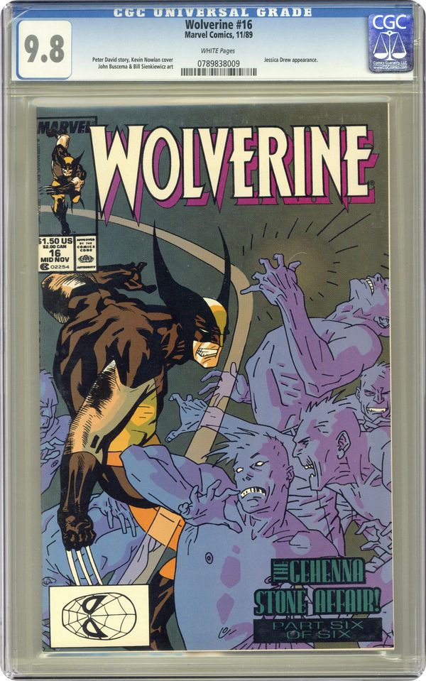 Direct Edition. The Gehenna Stone Affair: Part 6 of 6 - "Electric Warriors!" Written by Peter David. Art by John Buscema and Bill Sienkiewicz. Cover by Kevin Nowlan. The demonic Ba'al restores and takes control of the Genhenna Stone. Can Wolverine bring down this monster before it's too late? Don't miss the exciting conclusion to The Gehenna Stone Affair! 32 pages, FC Cover price $1.50. Grade: CGC 9.8 explanation of grade Condition: Used (collectible)