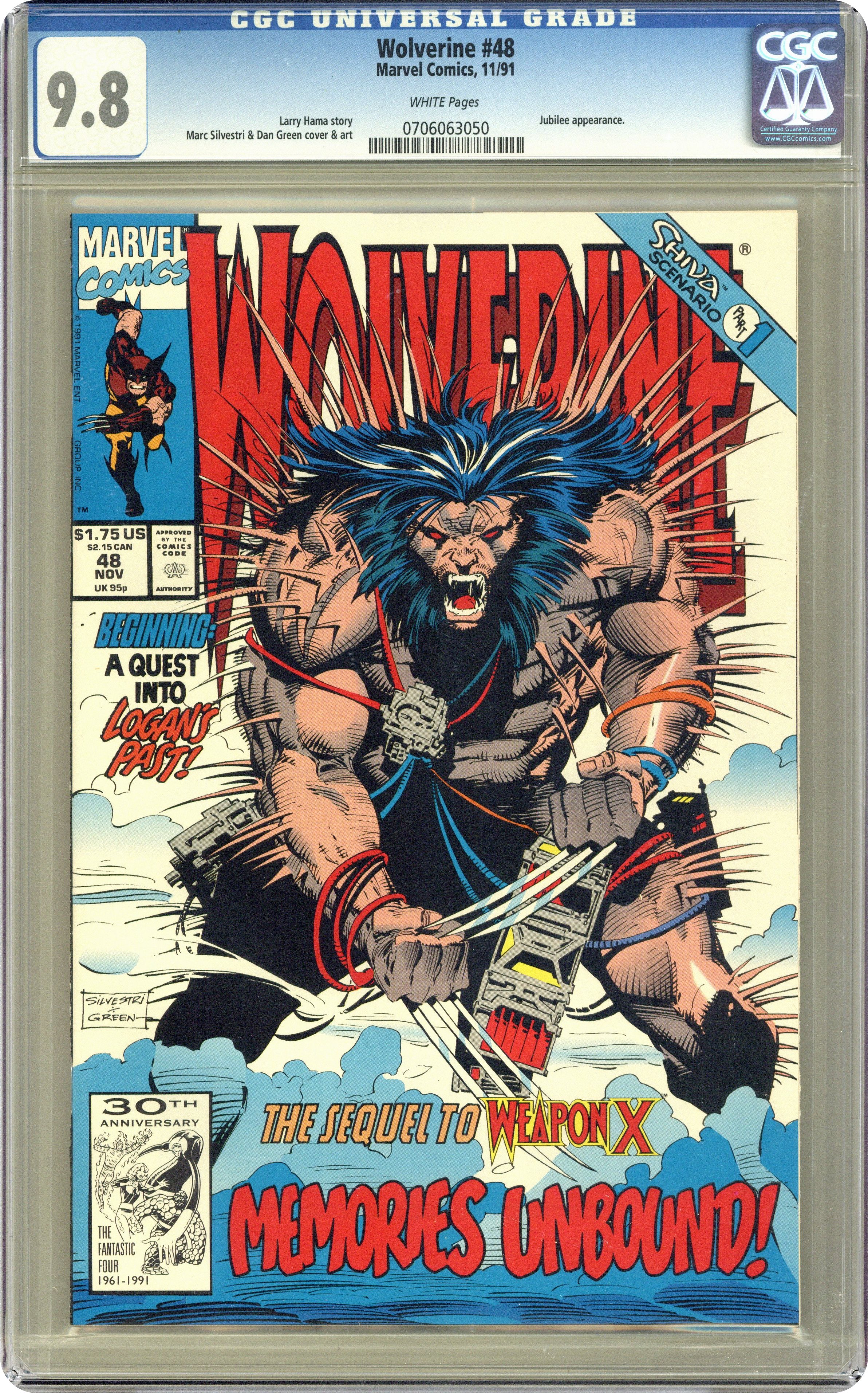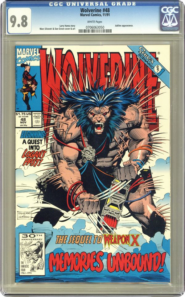 Shiva Scenario: Phase 1 of 3 - "Dreams of Gore!" Guest-starring Jubilee. Written by Larry Hama. Art by Marc Silvestri and Dan Green. Wolverine and Jubilee head to Canada in search for clues that will unlock the secrets to Logan's mysterious past. NOTE: The astounding sequel to Weapon X from Marvel Comics Presents (1988-1995) #72-84. Cover price $1.75. Grade: CGC 9.8 explanation of grade Condition: Used (collectible)