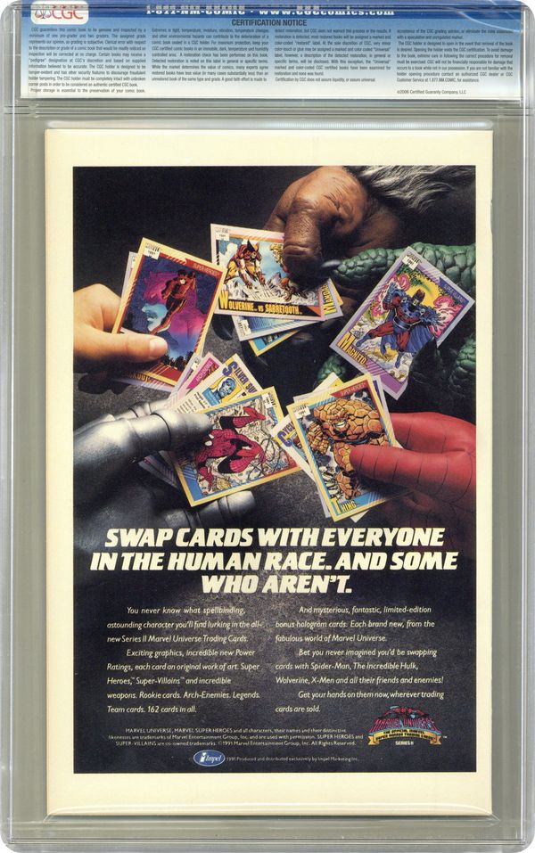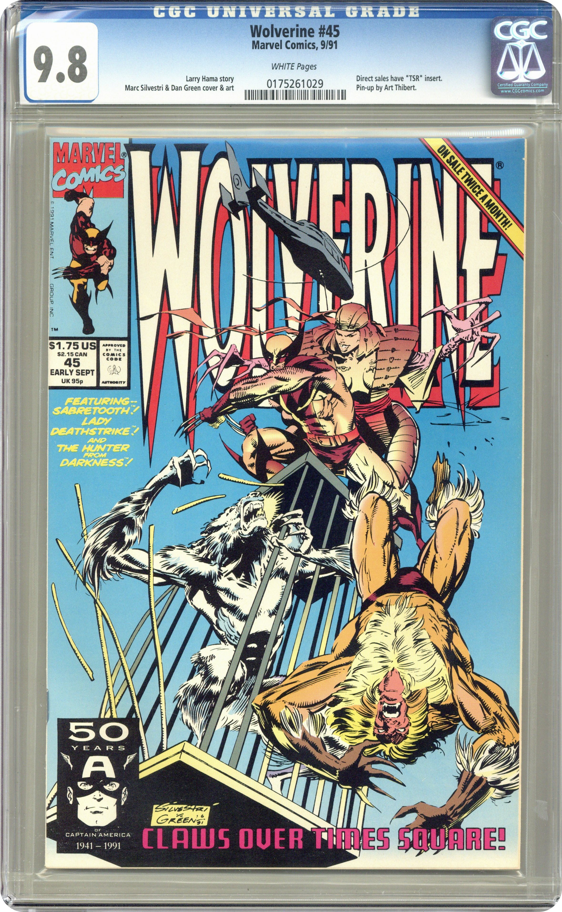 Ended Aug 5 2024 Winning Bid $25 Direct Edition. Part 1 of 2 - "Claws Over Times Square!" Written by Larry Hama. Art by Marc Silvestri and Dan Green. The savage creature known as the Hunter in the Darkness has been captured and put on display in a carnival. When the villains Sabretooth and Lady Deathstrike show up to cause trouble not even Wolverine may be able to stop them alone. Includes a 2-page pin-up by Art Thibert. 32 pages, FC Cover price $1.75. Grade: CGC 9.8 explanation of grade Condition: Used (collectible)