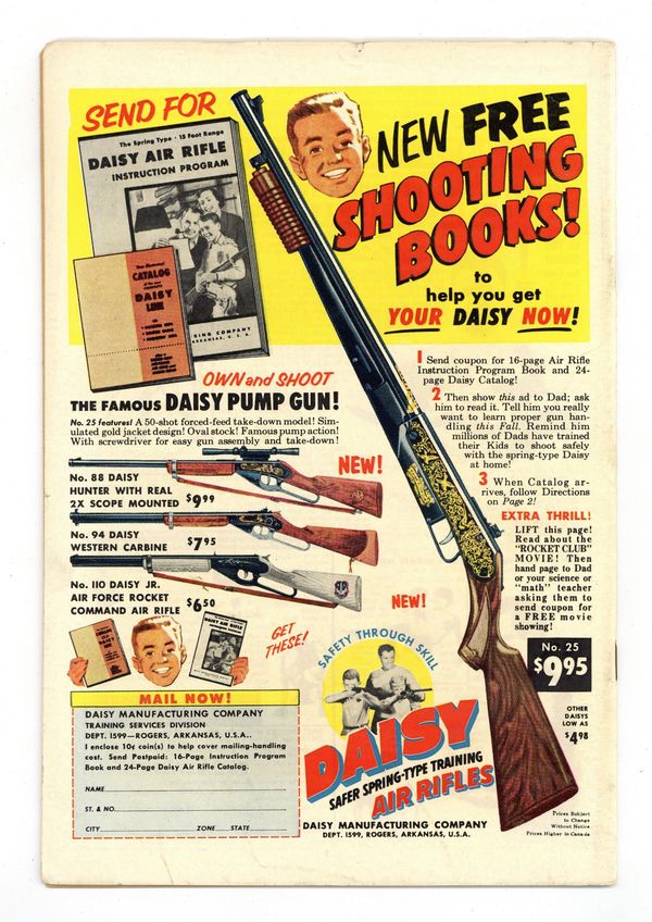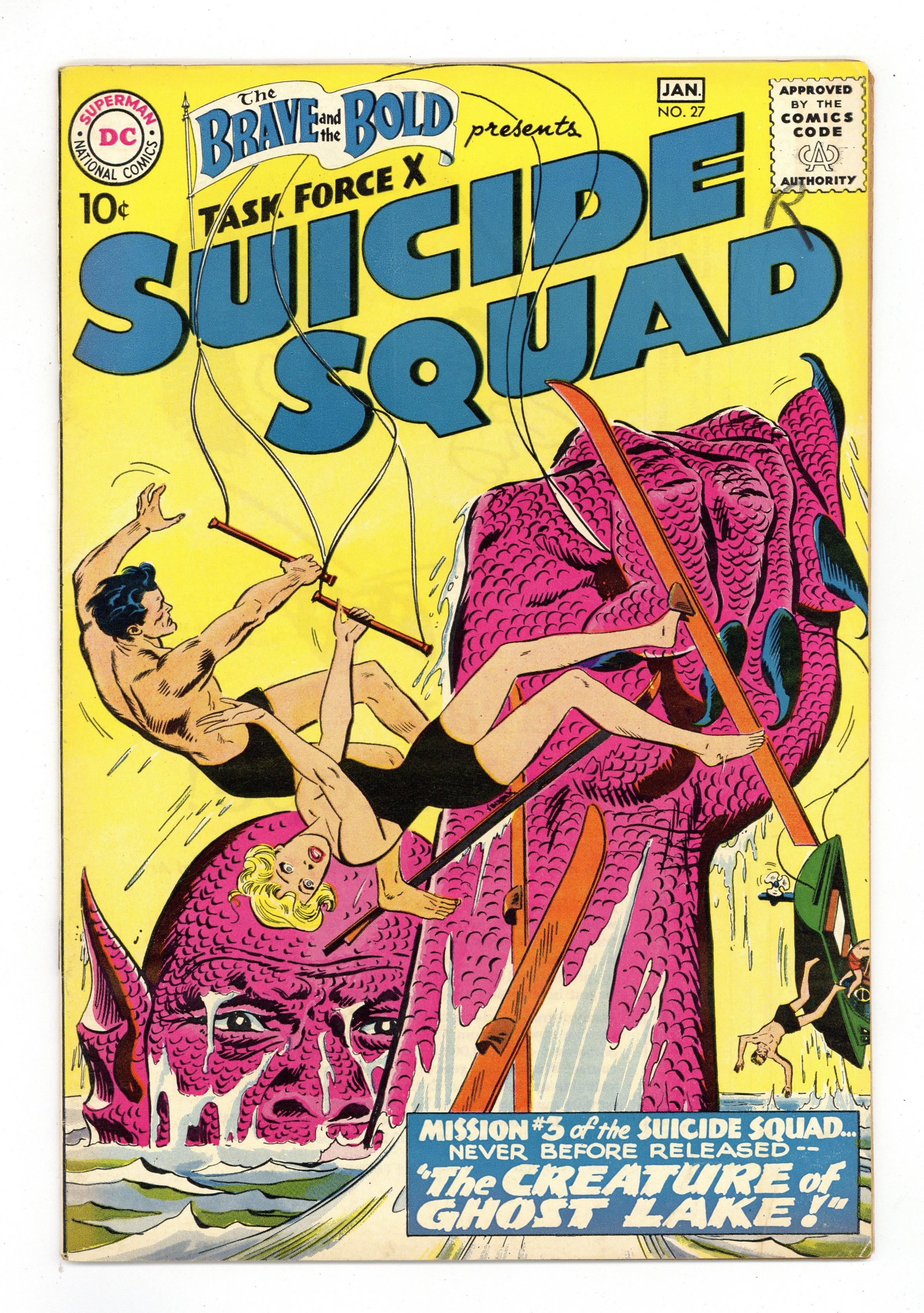Cover pencils by Ross Andru, inks by Mike Esposito. Mission #3 of the Suicide Squad - never before released - "The Creature of Ghost Lake," script by Robert Kanigher, pencils by Ross Andru, inks by Mike Esposito; Dr. Duane is missing, apparently having created a formula that grows things to giant size; Headquarters fears that Dr. Duane has been captured by enemy agents, and orders Suicide Squad to investigate unofficially; The team books into a nearby resort so as to search surreptitiously; A giant monster seizes both Karin and a nuclear bomb being tested with a time device. The Atom Servant of Man public service announcement; Various scientists around the world demonstrate uses of radio-isotopes. The Menace of the Driver Ants! article. Robot Bombs Over London! article; Description of V-1 bombs and the German attacks on London. 36 Pages, Full Color. Cover price $0.10. Grade: VG/FN 5.0 explanation of grade Condition: Used (collectible)