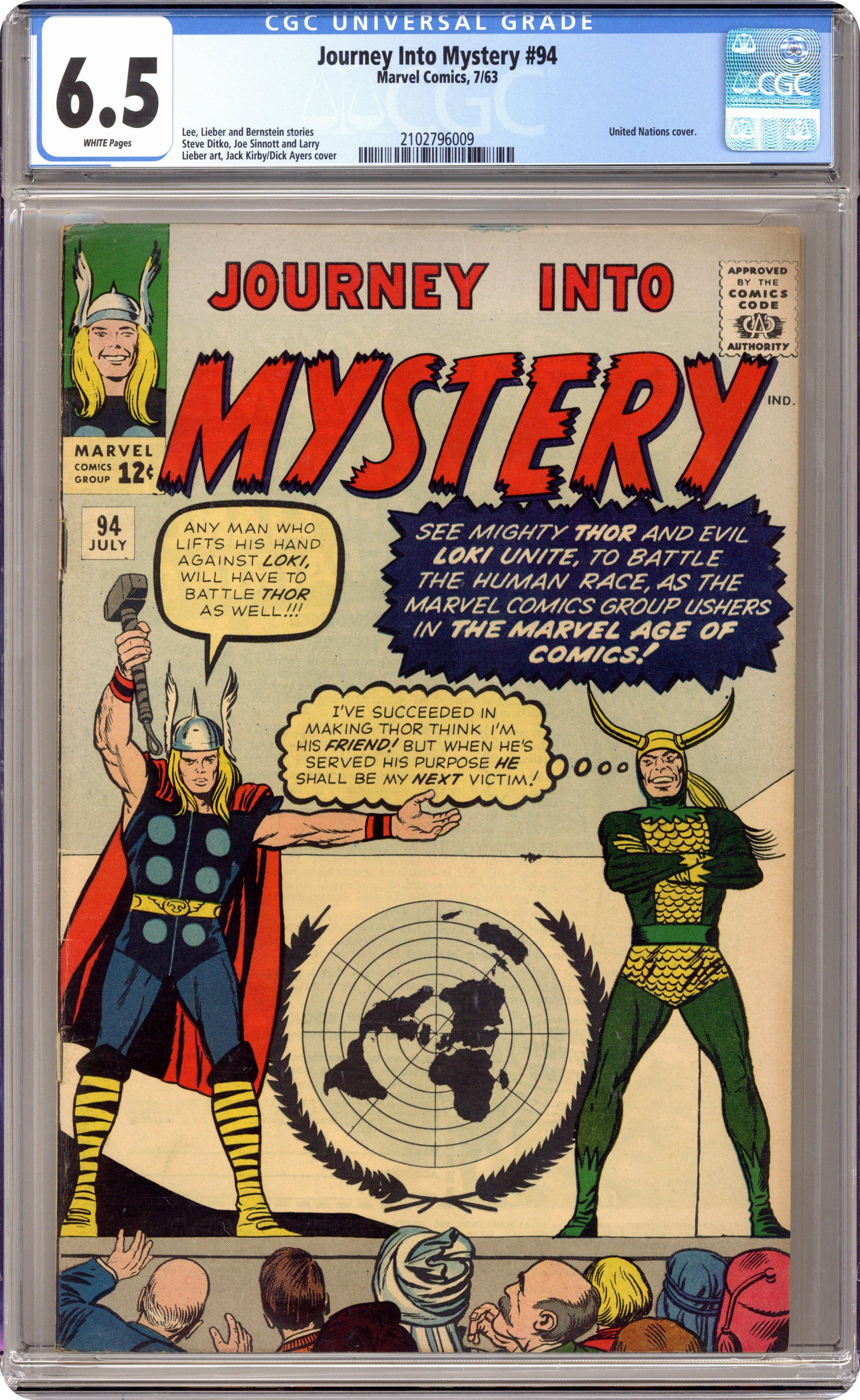 Cover pencils by Jack Kirby, inks by Dick Ayers. "Thor and Loki Attack the Human Race!", script by Stan Lee (plot) and Robert Bernstein (script), art by Joe Sinnott; Loki uses his magic to cause Thor's hammer to hit his head, turning him evil; Odin and Heimdall appearances. "Bird Talk" two-page text story. "Dinner Time on Deimos!", script by Stan Lee (plot) and Larry Lieber (script), art by Larry Lieber; In the future, Earth is overpopulated, and even the very rich must work an hour on a farm each week to produce enough food. "The Gentle Old Man!", script by Stan Lee, art by Steve Ditko; A greedy landlord is captured by a time traveler who maintains a collection of 'dolls' consisting of miniaturized heartless people from different eras. 36 pgs., full color. $0.12. Cover price $0.12. Grade: CGC 6.5 explanation of grade Condition: Used (collectible)