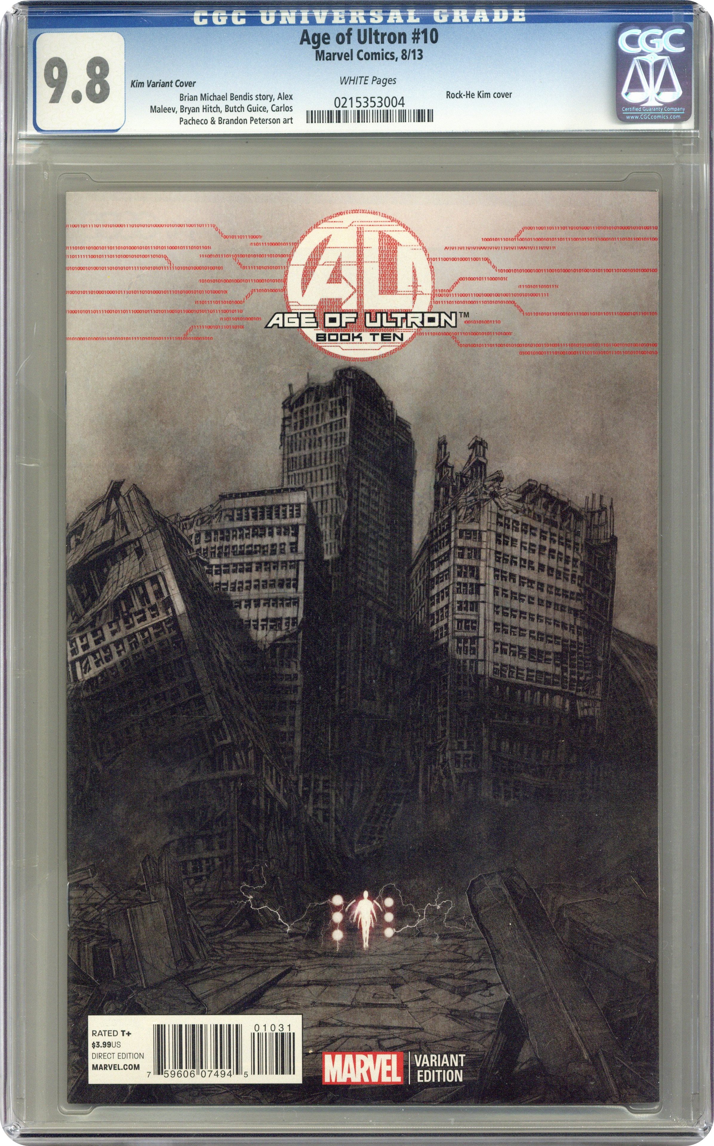 Originally polybagged but now unbagged for grading. Limited 1 for 25 Variant Wraparound Cover by Rock-He Kim. Written by Brian Michael Bendis. Art by Alex Maleev, Bryan Hitch, Butch Guice, Brandon Peterson, Carlos Pacheco, David Marquez, Joe Quesada, Paul Neary, Roger Bonet and Tom Palmer. THE FINALE! The biggest secret in comics will be revealed to you! An ending so confidential...even the artists of this book don't know what lies on the final pages...! NOTE: Due to code expiration date, Bagged and Un-bagged copies are sold as the same item. Cover price $3.99. Grade: CGC 9.8 explanation of grade Condition: Used (collectible)