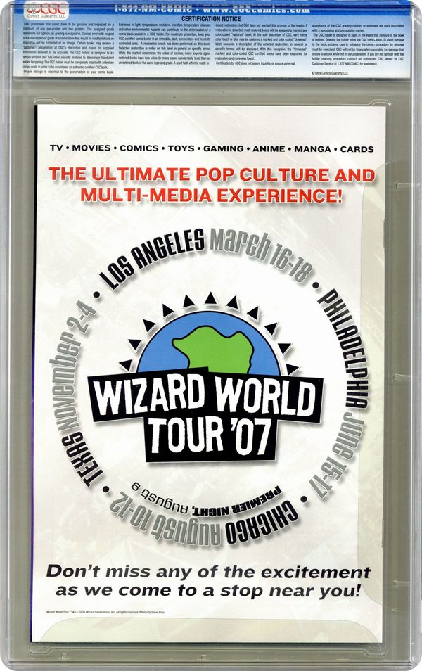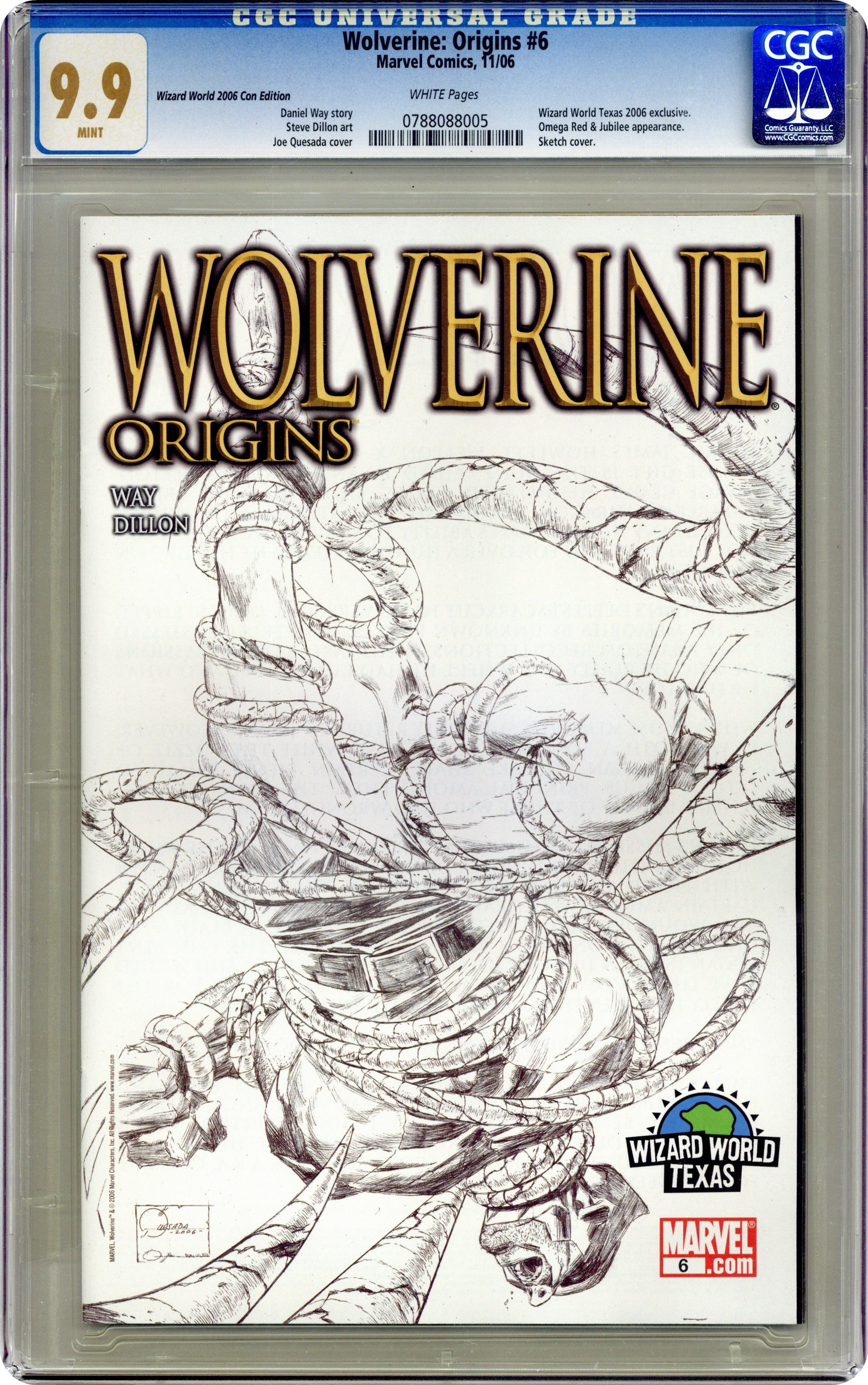 Wizard World Texas Sketch Cover by Joe Quesada. Written by DANIEL WAY. Penciled by STEVE DILLON. Cover by JOE QUESADA. Beginning the second arc! 'SAVIOR' Part 1 (of 5) Completely shattered by the revelations of last issue, Logan must now ask himself some hard-almost impossible-questions, such as whether or not he can continue on his quest...or if he even should. Though he now remembers who he was, the more pressing questions becomes who-and what-is he now? Answering these questions will take the help of one of Logan's closest friends...and one of his deadliest enemies...OMEGA RED! 32 PGS./Parental Advisory Grade: CGC 9.9 explanation of grade Condition: Used (collectible)