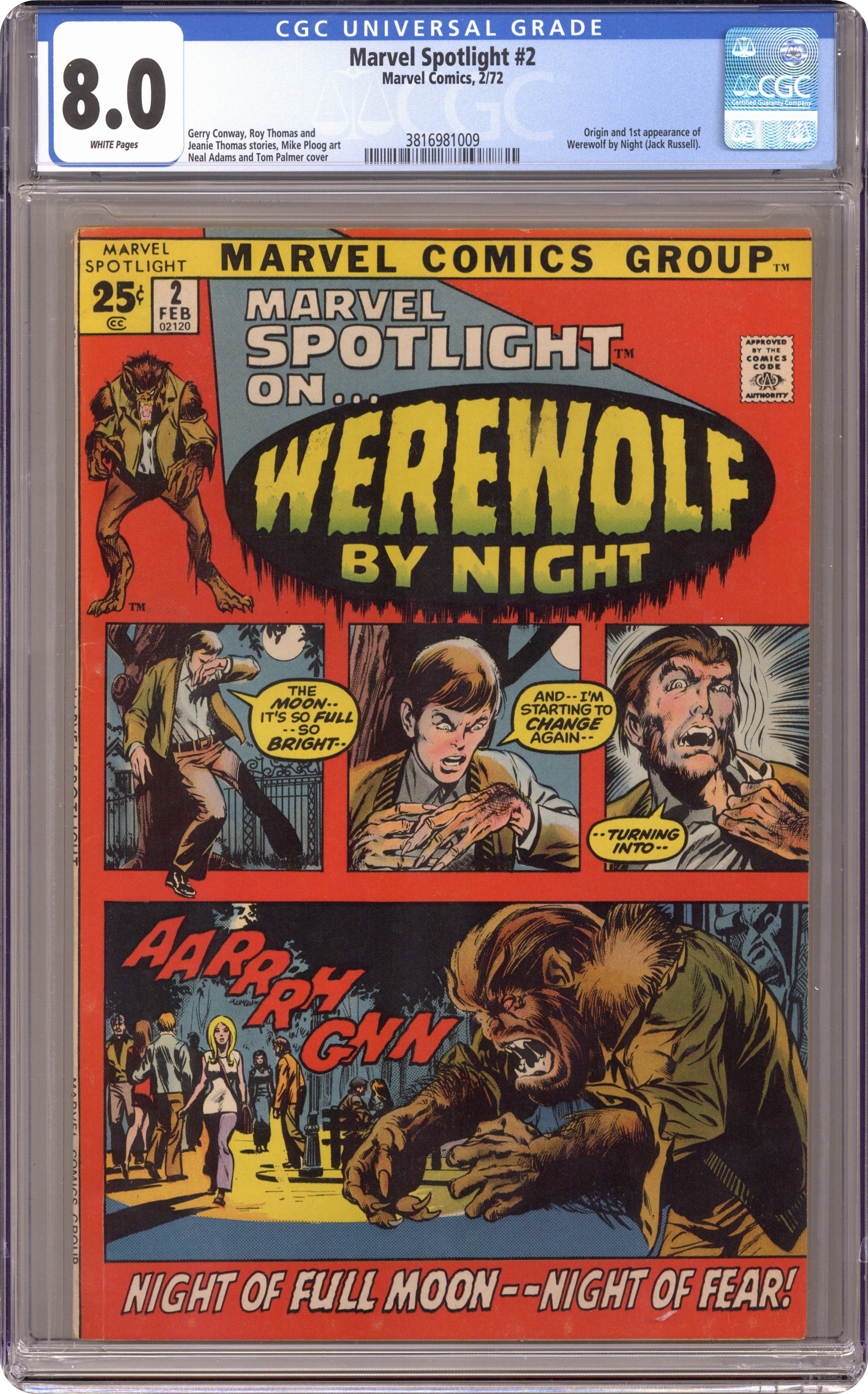Ended Jan 19 2024 Winning Bid $452 52-page giant. Origin and first appearance of Werewolf By Night. Cover pencils by Neal Adams, inks by Tom Palmer. First Night, script by Roy Thomas (plot); Jean Thomas (plot), and Gerry Conway (script), art by Mike Ploog; Jack learns of the family curse on his eighteenth birthday from his mother on her deathbead; Jack begins to believe that his step-father had his mother killed. House ad for Venus, art by Bill Everett. Where Gargoyles Dwell! starring Venus, script and art by Bill Everett. 52 pages, full color. Cover price $0.25. Grade: CGC 8.0 explanation of grade Condition: Used (collectible)