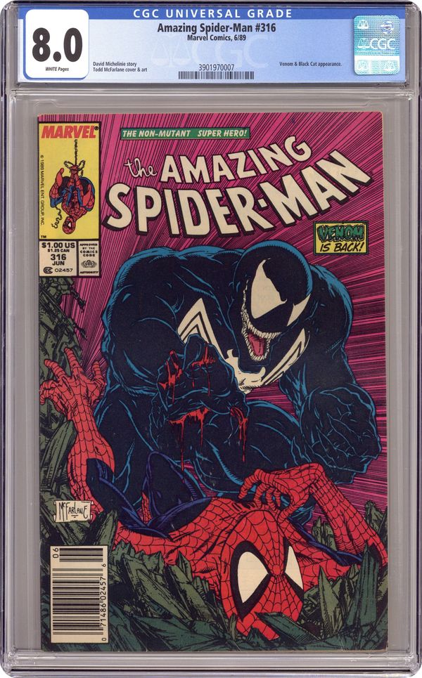 Newsstand Edition. "Dead Meat" Part 1 of 2. Script by David Michelinie. Art by Todd McFarlane. Cover by Todd McFarlane. Venom is back in New York City! And the deranged Eddie Brock is looking to kill Peter Parker or Spider-Man with extreme prejudice! However first the psychotic symbiote has to find where the Parkers are living! At the web-slinger's former Bedford Towers residence, Venom runs into and then runs roughshod over the Black Cat! But Felicia doesn't know where the wall-crawler is either! Later on Peter learns that his worst nightmare has returned and his family is in grave danger. Spider-Man can't wait for Venom to make the first move. The web-slinger must attack! Cameo appearances by Aunt May, Glory Grant, and Eduardo Lobo. (Note: This two-part story was reprinted in 1990 in the trade paperback: Spider-Man vs. Venom.) 36 pages. Cover price $1.00. Grade: CGC 8.0 explanation of grade Condition: Used (collectible)