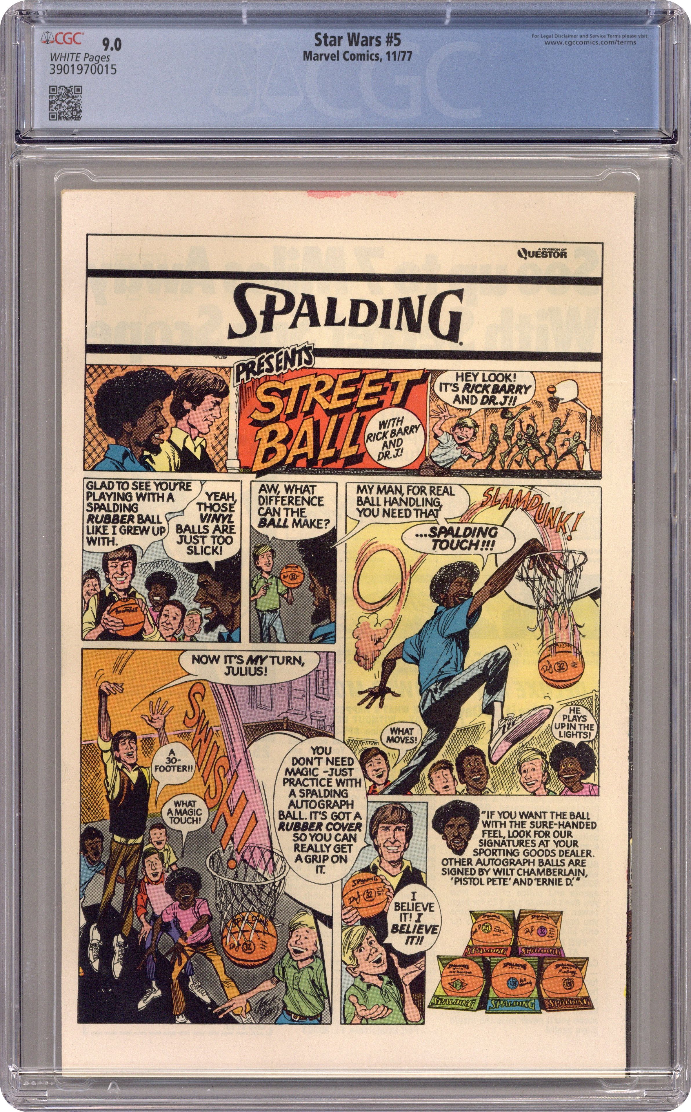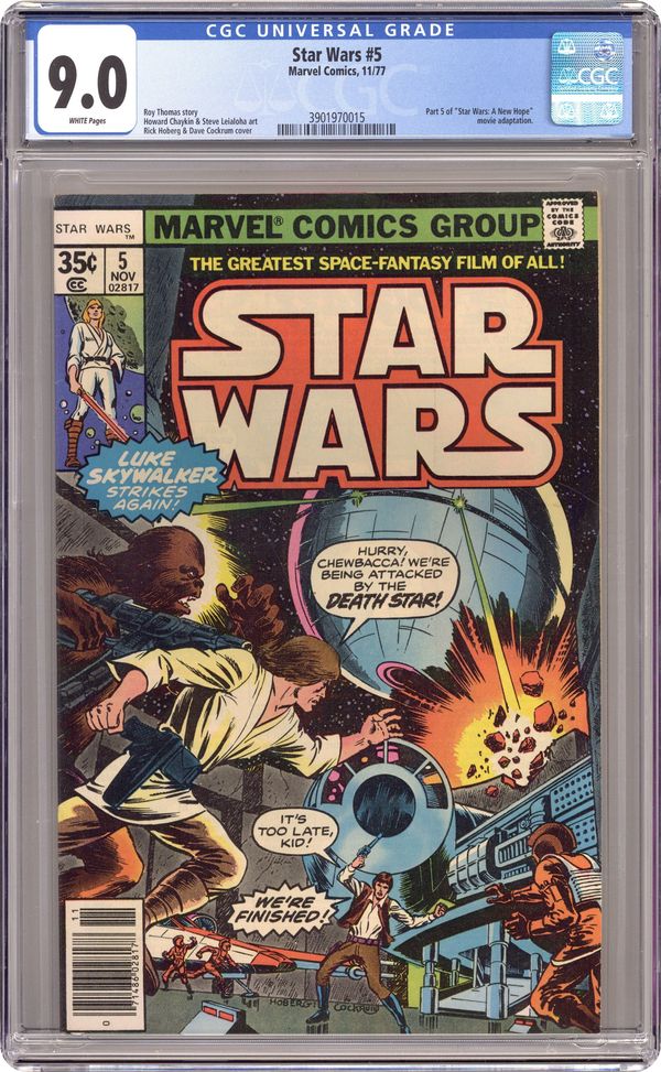 1st printing, standard 35 Cent Newsstand Edition with UPC. A New Hope: Part 5 of 6. "Lo, the Moons of Yavin!" Based on the screenplay by George Lucas. Adapted by Roy Thomas. Art by Howard Chaykin and Steve Leialoha. Luke does not have long to mourn the loss of Ben Kenobi as the Millennium Falcon is attacked from all sides by deadly Tie-Fighters. Even if these Rebel heroes do survive this latest attack, the Empire knows the location of the Rebel's secret headquarters. They don't have long before the Death Star, a space station with the power to destroy planets, delivers the killing blow to the rebellion once and for all. Cover price $0.35. Grade: CGC 9.0 explanation of grade Condition: Used (collectible)