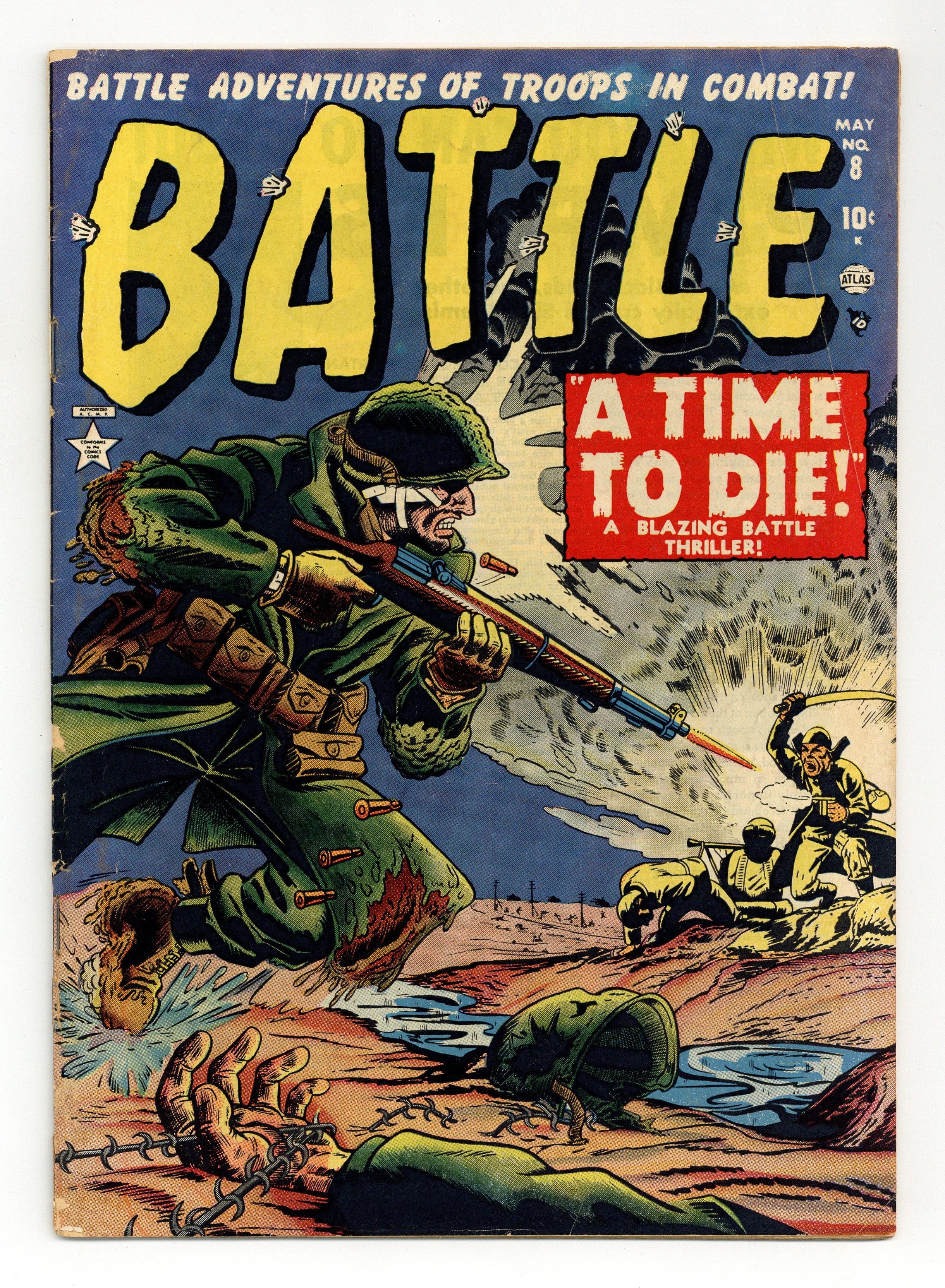 "A Time to Die" (art by Paul Reinman), "Pill Box" (art by Robert Q. Sale), "Boots," "Mopping-Up," "Grenade" (art by Dave Berg), and a two-0page text story, "The Artillery of Chenyang." Cover price $0.10. Grade: VG- 3.5 explanation of grade Condition: Used (collectible)
