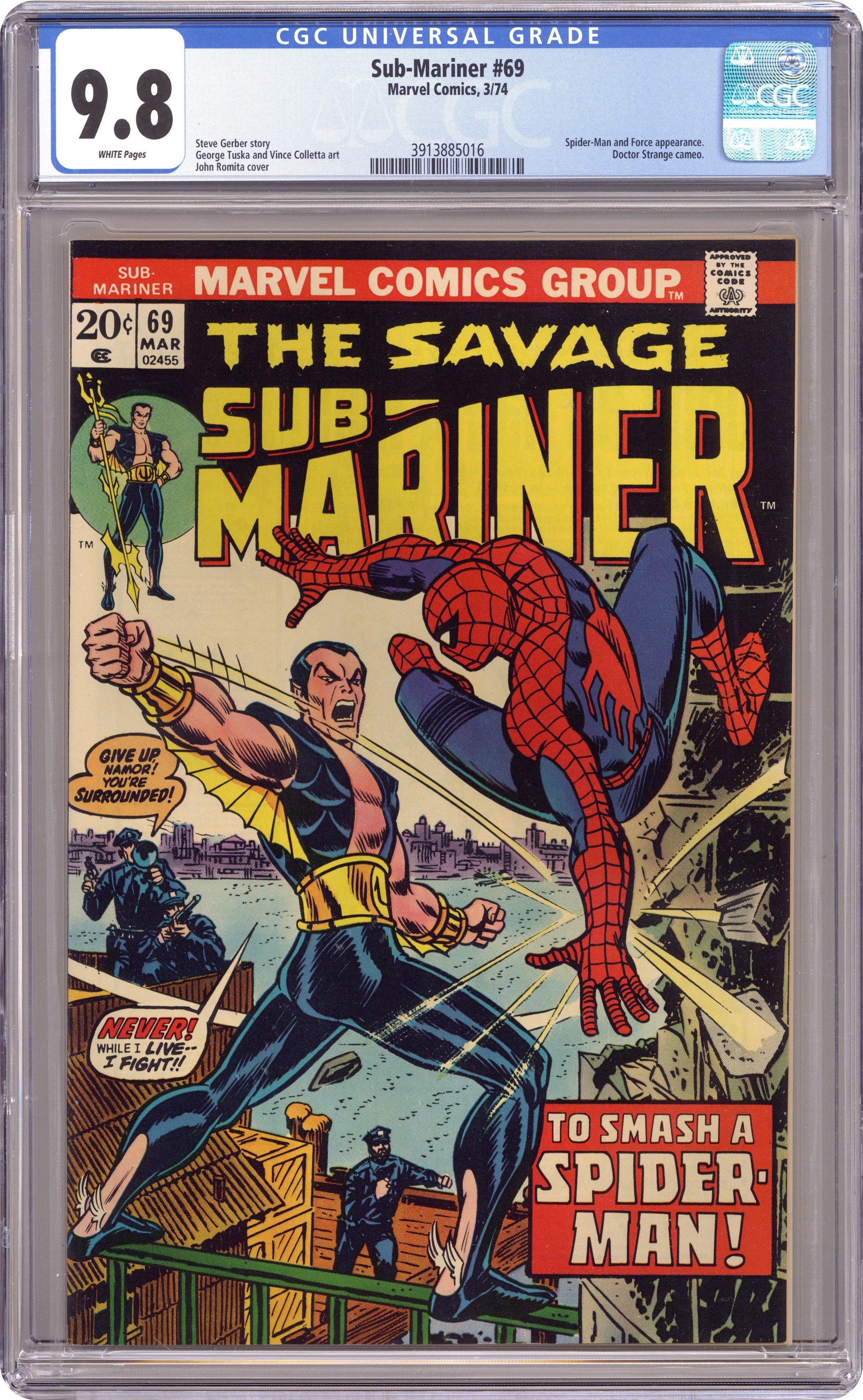 Ended Jan 28 2024 Winning Bid $599 Two Worlds and Dark Destiny! Guest-starring Spider-Man. Script by Steve Gerber. Pencils by George Tuska. Inks by Vince Colletta. Cover by John Romita. The Avenging Son rampages through Empire State University! Why? Because hes trying to locate an ESU professor that can save Atlantis and her comatose citizens! But a certain web-slinging student isnt fond of Prince Namor wrecking his favorite campus! Once Spider-Man corrals the Sub-Mariner, he directs the Prince of Atlantis to the right place! And there the Avenging Son learns that he must find and defeat Force (again) to protect his undersea kingdom! Imperious Rex! Last 20ยข issue. Cameo appearances by Doctor Strange, Namorita, and Tamara. Flashback cameo by Orka. (Notes: Spider-Man and the Sub-Mariner meet again in Amazing Spider-Man 211. Force returns in Iron Man 140. The letters page contains Marvel Value Stamp series A #20 Brother Voodoo. The bullpen bonus page contains promotional stamp #5 the Hulk. The promotional stamp is not to be confused with the actual series A stamp #5.) 32 pages. Cover price $0.20. Grade: CGC 9.8 explanation of grade Condition: Used (collectible)