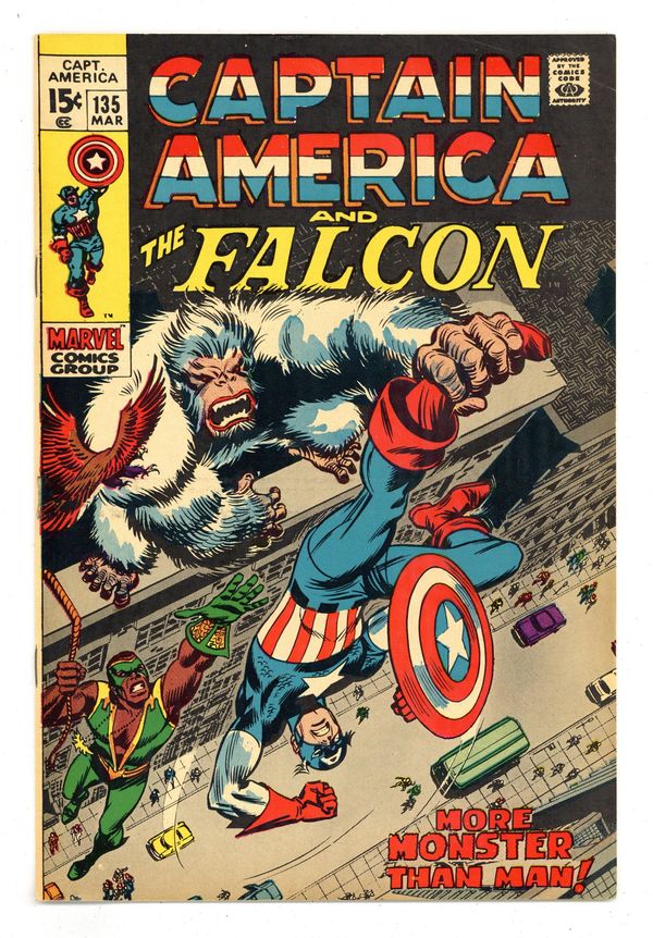 Ended Dec 11 2023 Winning Bid $11 Cover by John Romita. "More Monster Than Man!", script by Stan Lee, pencils by Gene Colan, inks by Tom Palmer (Palmer is generally acknowledged as Colan's best inker, but this is his only work with Colan on Cap); Captain America takes Falcon to SHIELD headquarters to meet Nick Fury; Falcon battles Dum-Dum Dugan in the gym; Cap tries to talk to Sharon, but she brushes him off, citing the new Project Earth-Dig; Cap and the Falcon battle Dr. Erik Gorbo, a SHIELD scientist who has gone on a crime spree after turning himself into a monster ape. Missive from letter hack Guy Lilliam III. 36 pgs., full color. $0.15. Cover price $0.15. Grade: FN- 5.5 explanation of grade Condition: Used (collectible)