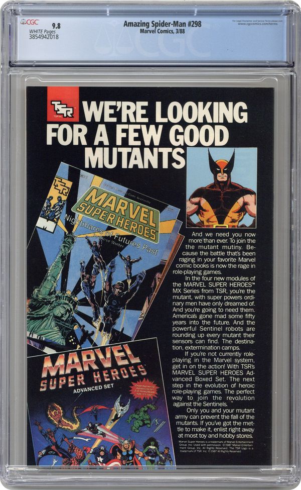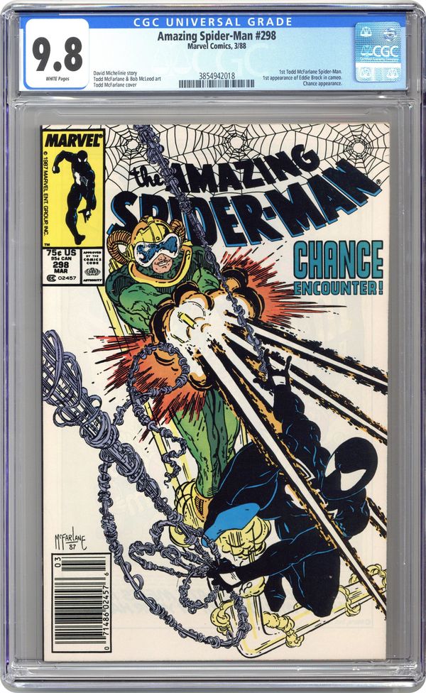 Direct Edition. "Chance Encounter!" Part 1 of 2. Script by David Michelinie. Pencils by Todd McFarlane. Inks by Bob McLeod. Cover by Todd McFarlane. Chance is back in business and working a new job for the Life Foundation! The clandestine organization wants Chance to steal an arms shipment coming into the west side docks! That should be a piece of cake for the high-flying mercenary! However, the Daily Bugle dispatches an undercover photographer to observe the delivery! And beneath the moonlit sky, fireworks explode when Chance and the Amazing Spider-Man throw down on the docks! First appearance (and cameo on the last page) by Eddie Brock (aka Venom). First appearance of Carlton Drake of the Life Foundation. Cameo appearances by Mary Jane Watson, Joy Mercado, and Joe Robertson. (Notes: Chance previously appeared in Web of Spider-Man 15. This issue begins Todd McFarlane's 2-year run as the penciler of the Amazing Spider-Man series.) 36 pages. Cover price $0.75. Grade: CGC 9.8 explanation of grade Condition: Used (collectible)