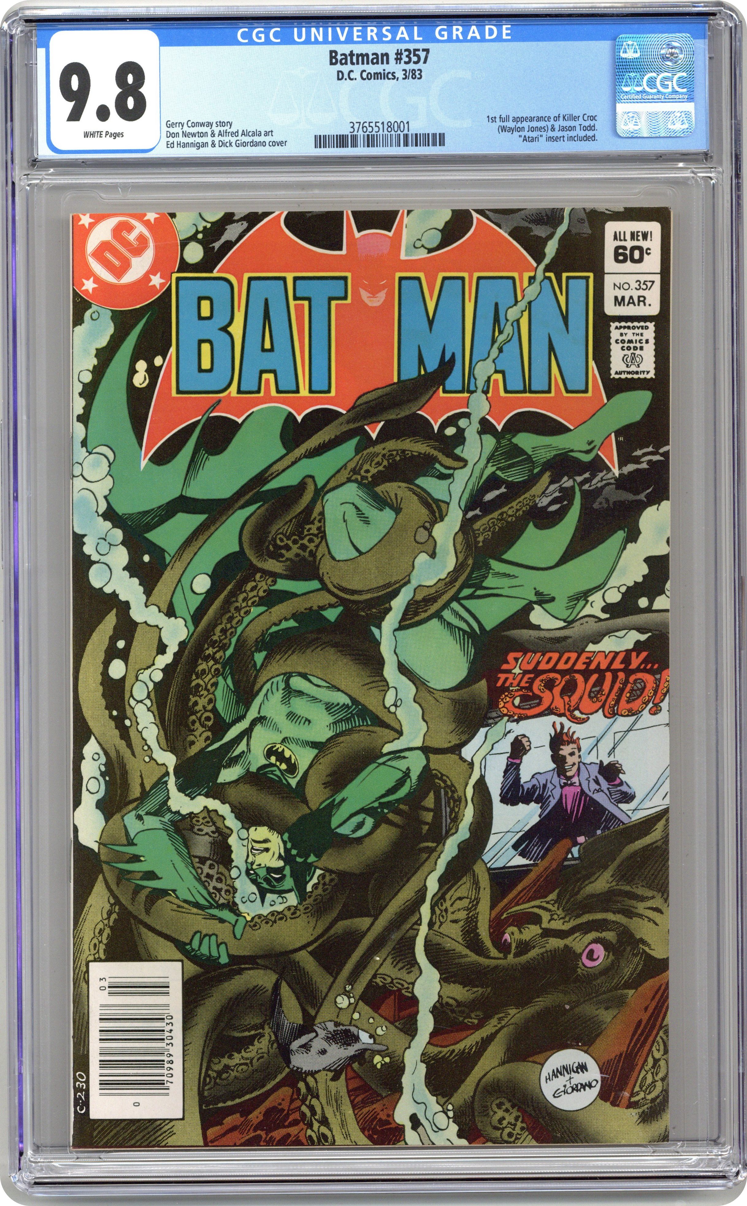 1st printing. Direct Edition. 1st appearance of Jason Todd and Killer Croc (cameo). Cover pencils by Ed Hannigan, inks by Dick Giordano. "Squid" starring Batman, Dick Grayson, Commissioner Gordon, Hamilton Hill, Joey Taylor, Waldo Flynn, Olivia Ortega, and the Squid (first appearance), script by Gerry Conway, pencils by Don Newton, inks by Alfredo Alcala; The Squid comes to Gotham City to launch a takeover of its underworld, and to trap the Batman; A mobster offering crooked protection threatens a circus owner; Refusing to give in, the owner unwittingly puts a target on the heads of his star performers, a husband and wife trapeze act; Days later, a young boy discoveres that his parents had been brutally murdered. Taken in by the sympathetic millionaire Bruce Wayne (Batman) the boy trains and becomes his new mentor's sidekick as Robin, the boy wonder; Not Dick Grayson, though--This time it was the copycat story of Jason Todd, the second person to become Robin. Story continues in the pages of Detective Comics (1937 1st Series) #524. Letter to the editor from comics editor/writer Kevin Dooley. 40 Pages, Full Color. Cover price $0.60. Grade: CGC 9.8 explanation of grade Condition: Used (collectible)