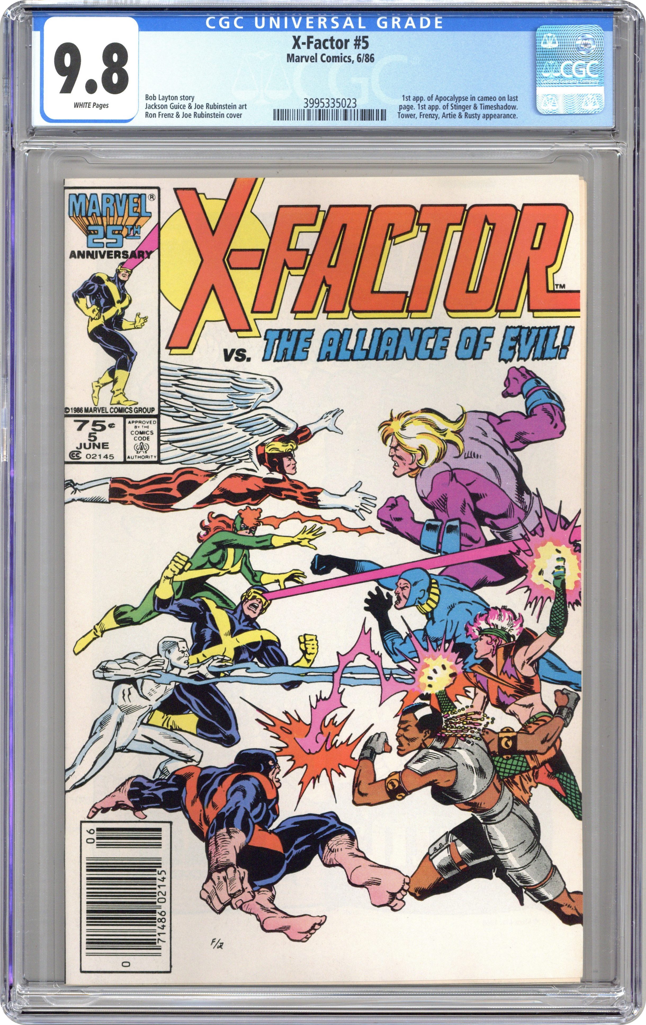 Direct Edition. "Tapped Out!" Part 1 of 2. 1st appearance of Apocalypse (shadowed cameo). Story by Bob Layton. Art by Jackson Guice and Joe Rubinstein. Cover by Ron Frenz and Joe Rubinstein. It's a classic super-hero/super-villain throw-down when X-Factor must battle the Alliance of Evil (Frenzy, Tower, Stinger, and Timeshadow) for the life of a mutant. Featuring a new menace by the name of Apocalypse, an evil mutant who will become a major thorn in the sides of the X-Men and X-Factor. Cover price $0.75. Grade: CGC 9.8 explanation of grade Condition: Used (collectible)