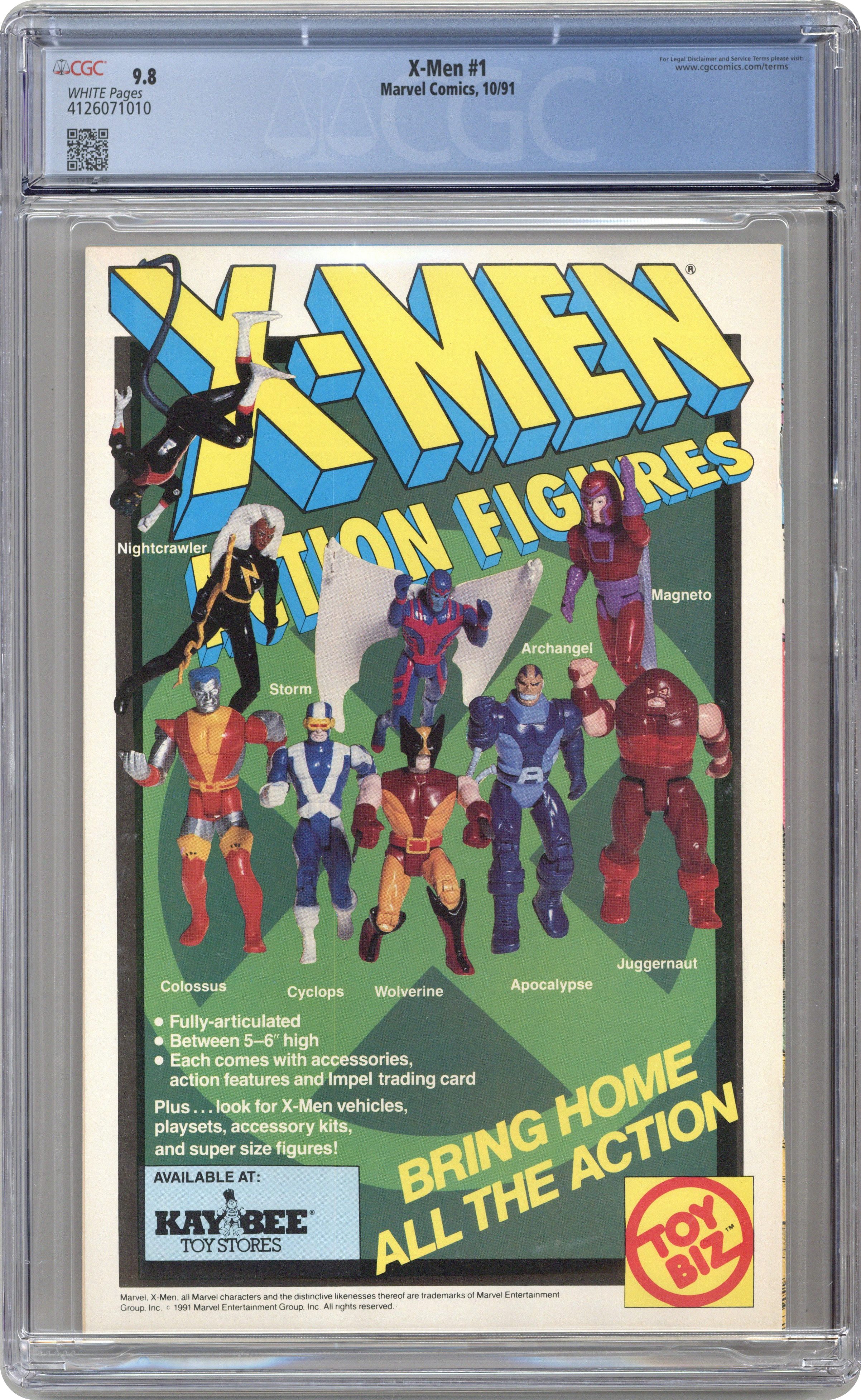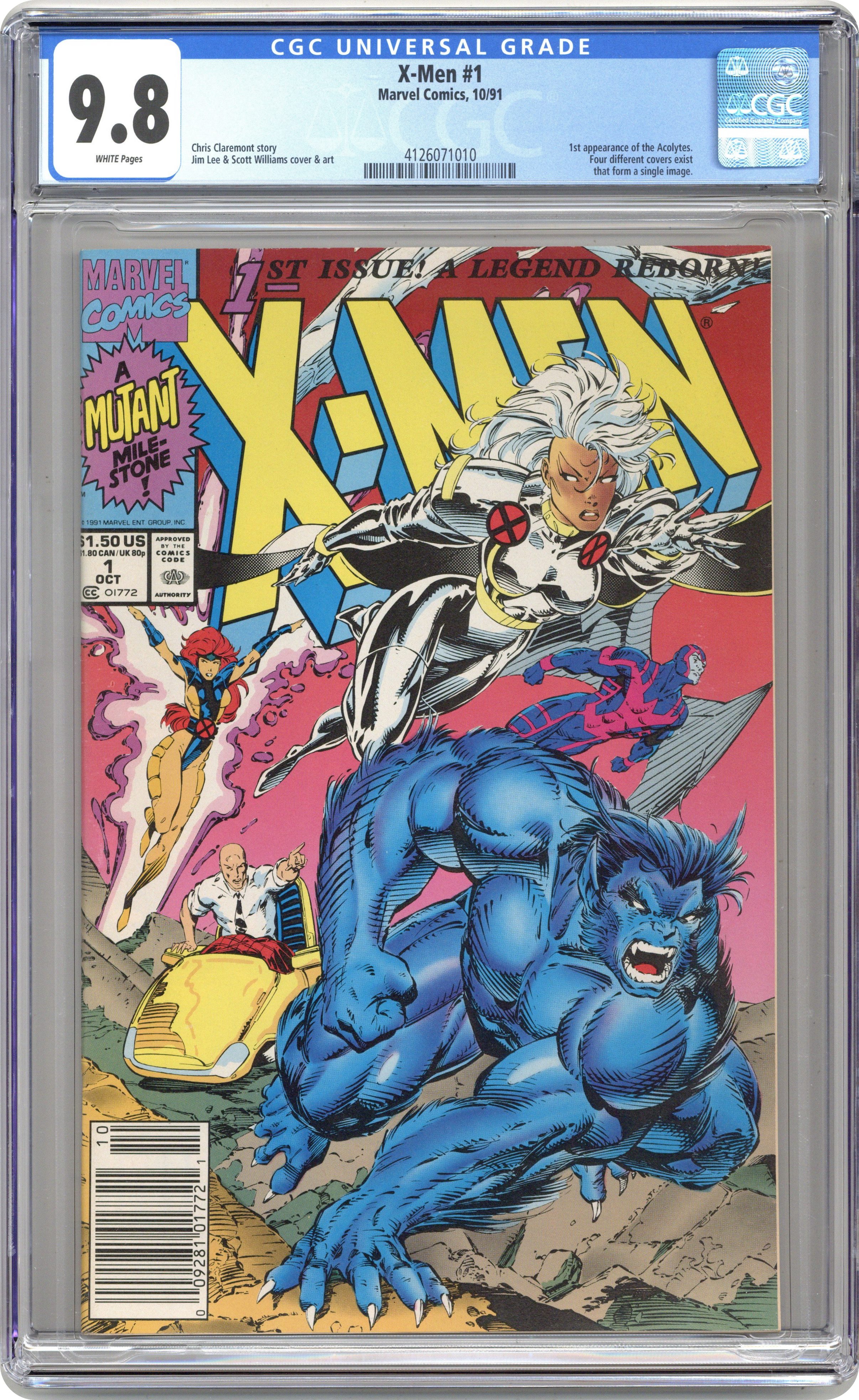 Direct Edition. Beast/Storm double cover. Cover pencils by Jim Lee (signed), inks by Scott Williams. Rubicon, script by Jim Lee (Co-Plot) and Chris Claremont, pencils by Jim Lee, inks by Scott Williams; Magneto forms the Acolytes and proclaims Asteroid M a haven for mutants everywhere; But the rest of the world doesn't see it that way; Nick Fury cameo. 2-page pin-up: gallery of X-Men villains. X-Men Sketchbook by Jim Lee. Cover price $1.50. NOTE: Cover A connects to covers 1B, 1C, and 1D to form a single giant image. Cover price $1.50. Grade: CGC 9.8 explanation of grade Condition: Used (collectible)
