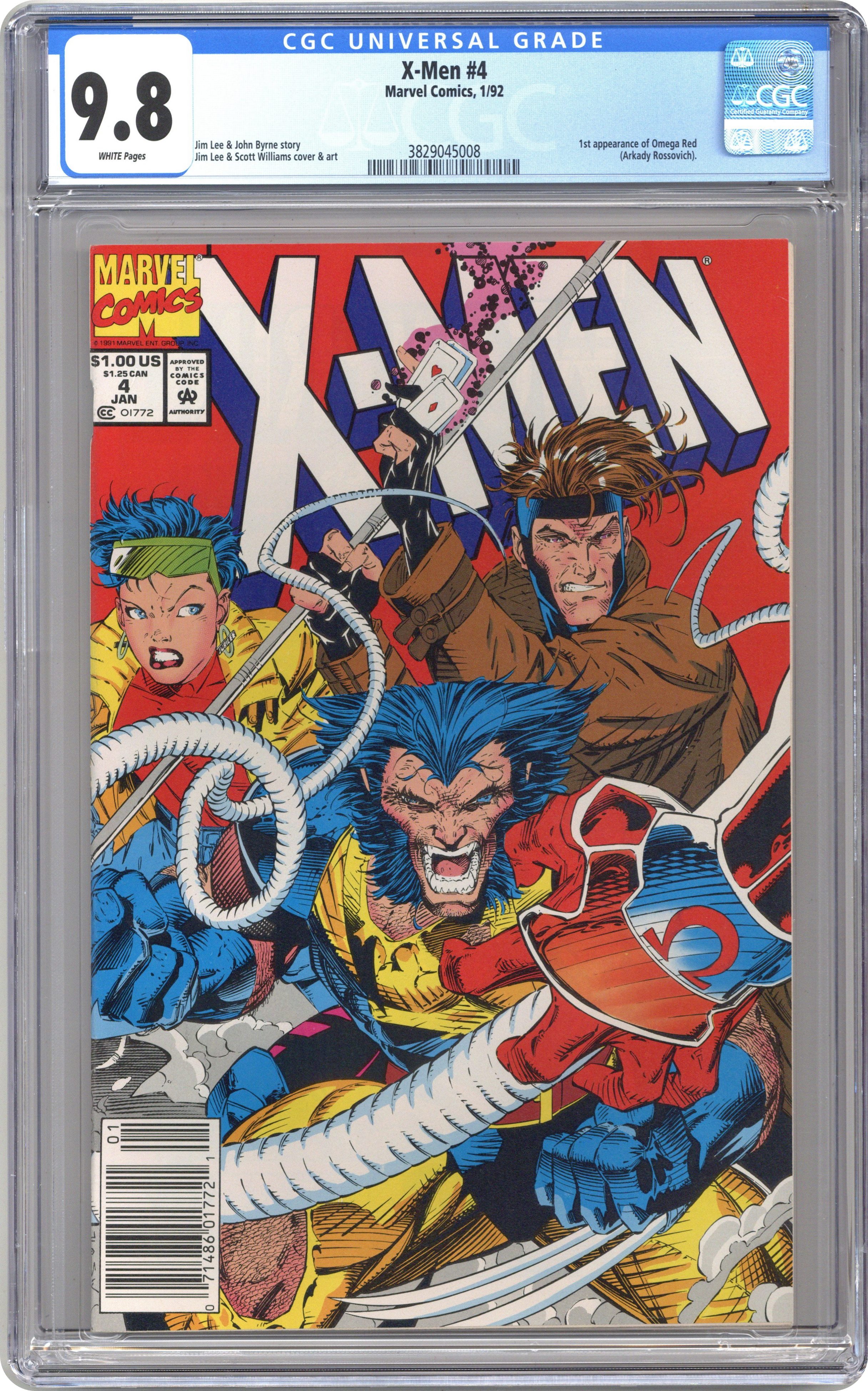 Direct Edition. Cover pencils by Jim Lee, inks by Scott Williams. The Resurrection and the Flesh, script by Jim Lee (Plot) and John Byrne, pencils by Jim Lee, inks by Scott Williams. First appearance of Omega Red! The Hand brings Omega Red (formerly Arkady) back to life; The X-Men play basketball, mutant style; Moira agonizes over her part in the Magneto fiasco and leaves; Gambit and Rogue are on the way to a chaperoned date when Omega Red and the Hand interfere. Cover price $1.00. Grade: CGC 9.8 explanation of grade Condition: Used (collectible)