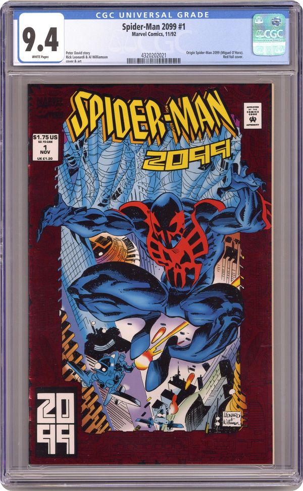 Direct Edition. Miguel O'Hara may be a genius, but he's not quick enough to keep from getting addicted to Rapture. So he experiments on himself, but the outcome isn't quite what he expected in this untitled tale. Script by Peter David, pencils by Rick Leonardi, inks by Al Williamson. Red foil stamped cover by Leonardi & Williamson. Cover price $1.75. Grade: CGC 9.4 explanation of grade Condition: Used (collectible)