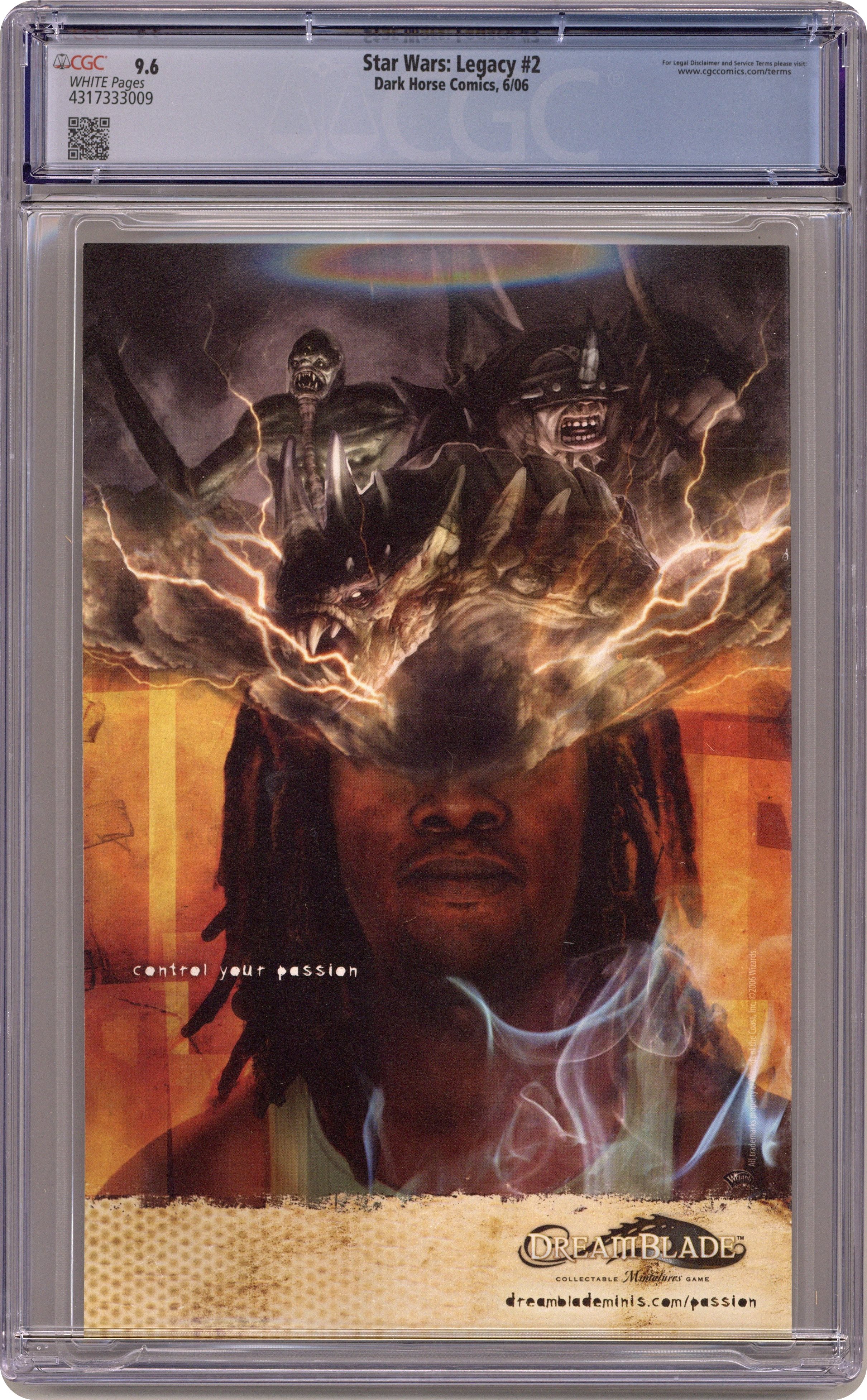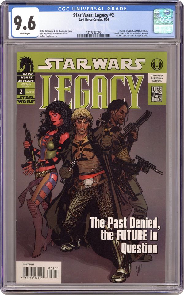 First Printing. JOHN OSTRANDER (W), JAN DUURSEMA (P), DAN PARSONS (I), BRAD ANDERSON (C), and ADAM HUGHES (Cover). Over the bodies of their enemies, two Jedi make a pact that will set them on the path to a greater danger than they have ever known . . .Bounty hunters capture a prisoner whose presence will test their resolve?and the strength of their alliance . . . A Sith apprentice is given the honorific "Darth" and sent to hunt a quarry whose capture?or death?could shake an empire to its foundations . . . And a Princess finds herself alone in the galaxy, pursued by those she once counted as allies. This is only the second issue of the new ongoing series Star Wars: Legacy and already there's more adventure and more intrigue than we can even hint at! FC, 32pg Cover price $2.99. Grade: CGC 9.6 explanation of grade Condition: Used (collectible)