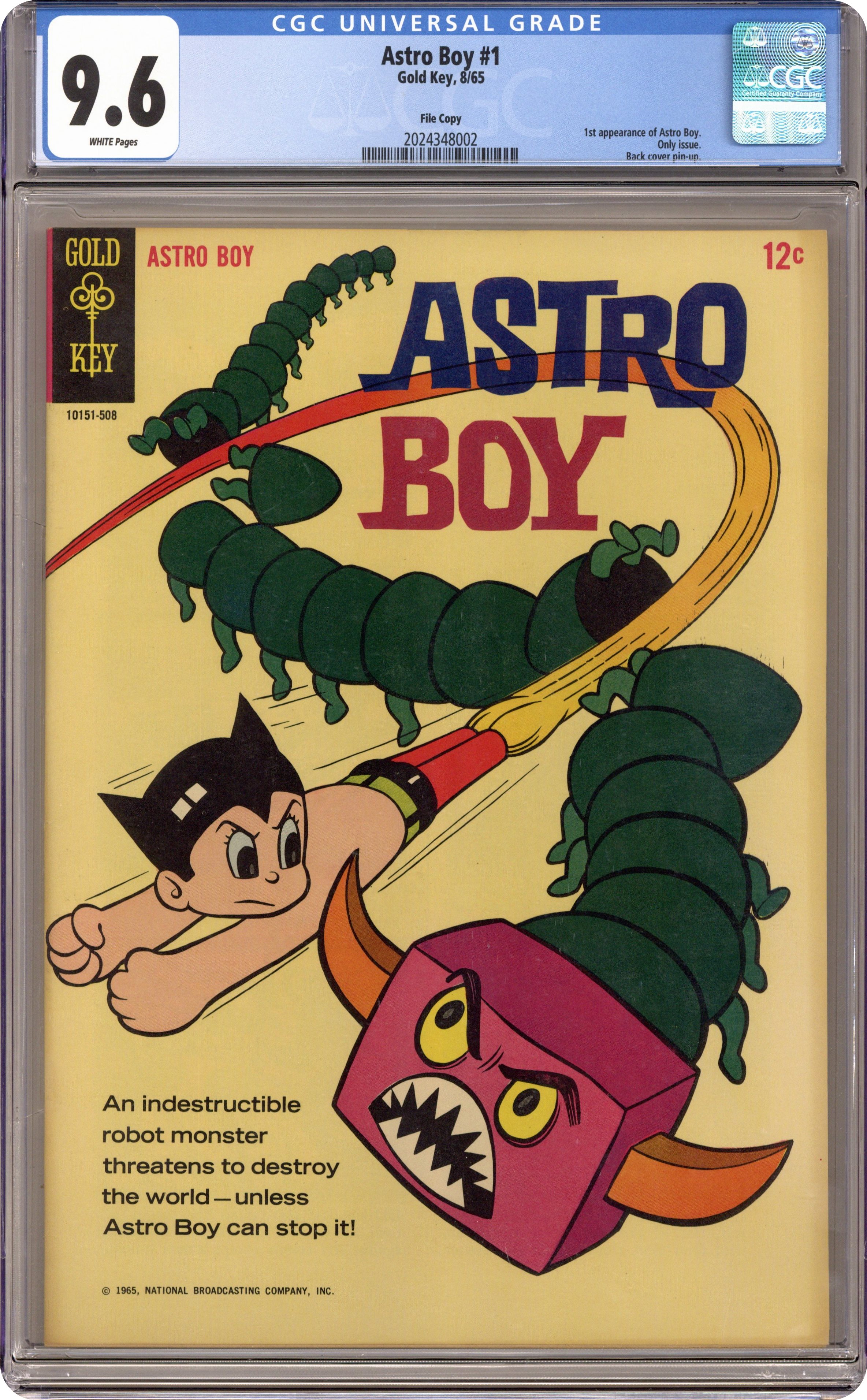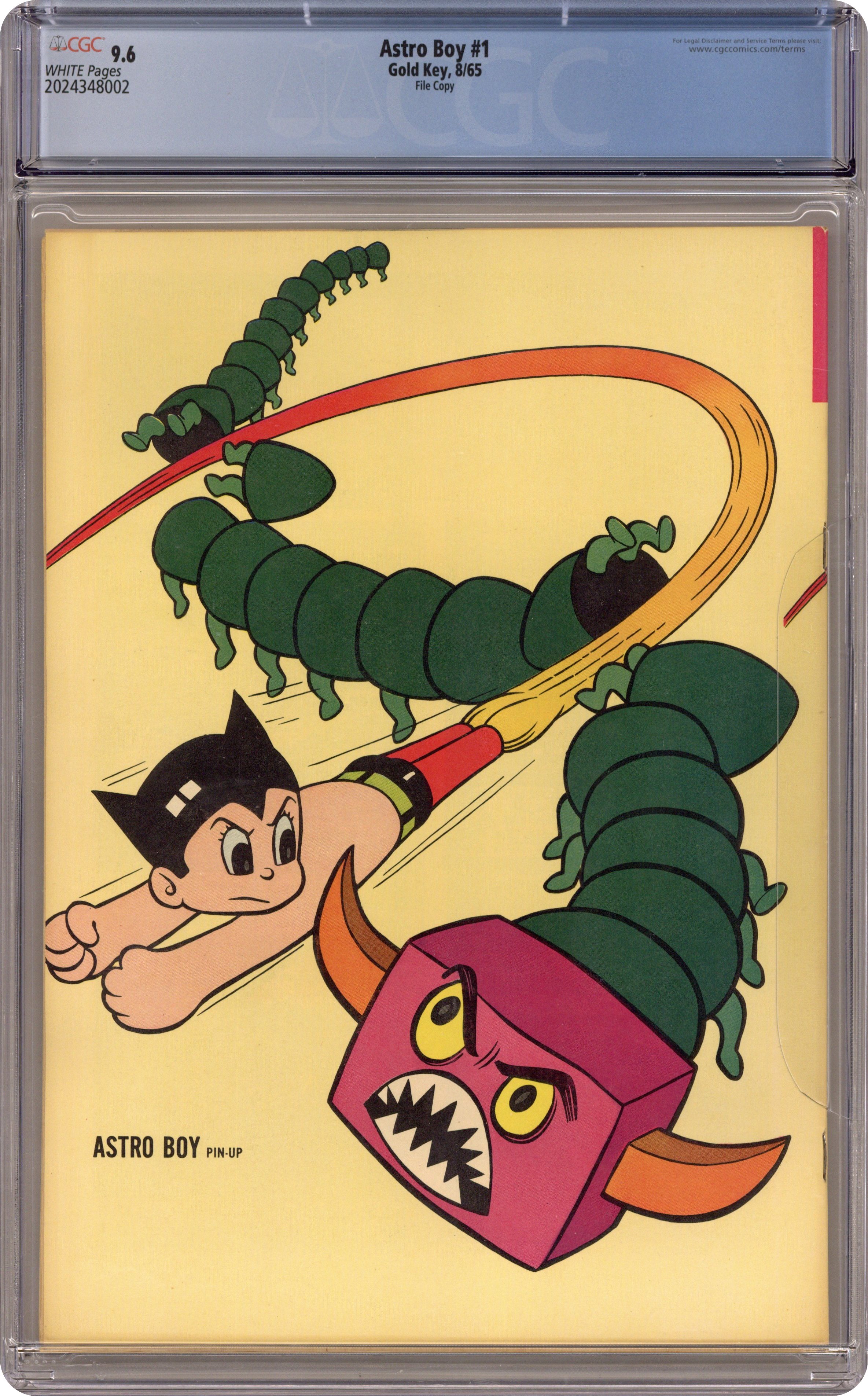 Ended Jan 19 2024 Winning Bid $2,426 10151-508. 1st comic book appearance Astro Boy. "Gangor the Monster," script by Fred Fredericks (?); An indestructible, centipede-like monster threatens to destroy the world—unless Astro Boy can stop him. "Attack of the Mud People," script by Fred Fredericks (?); Astro Boy battles Mud People. Astro Boy pinup on the back cover, same as the front minus the lettering. 36 pgs., full color. Cover price $0.12. Grade: CGC 9.6 explanation of grade Condition: Used (collectible)