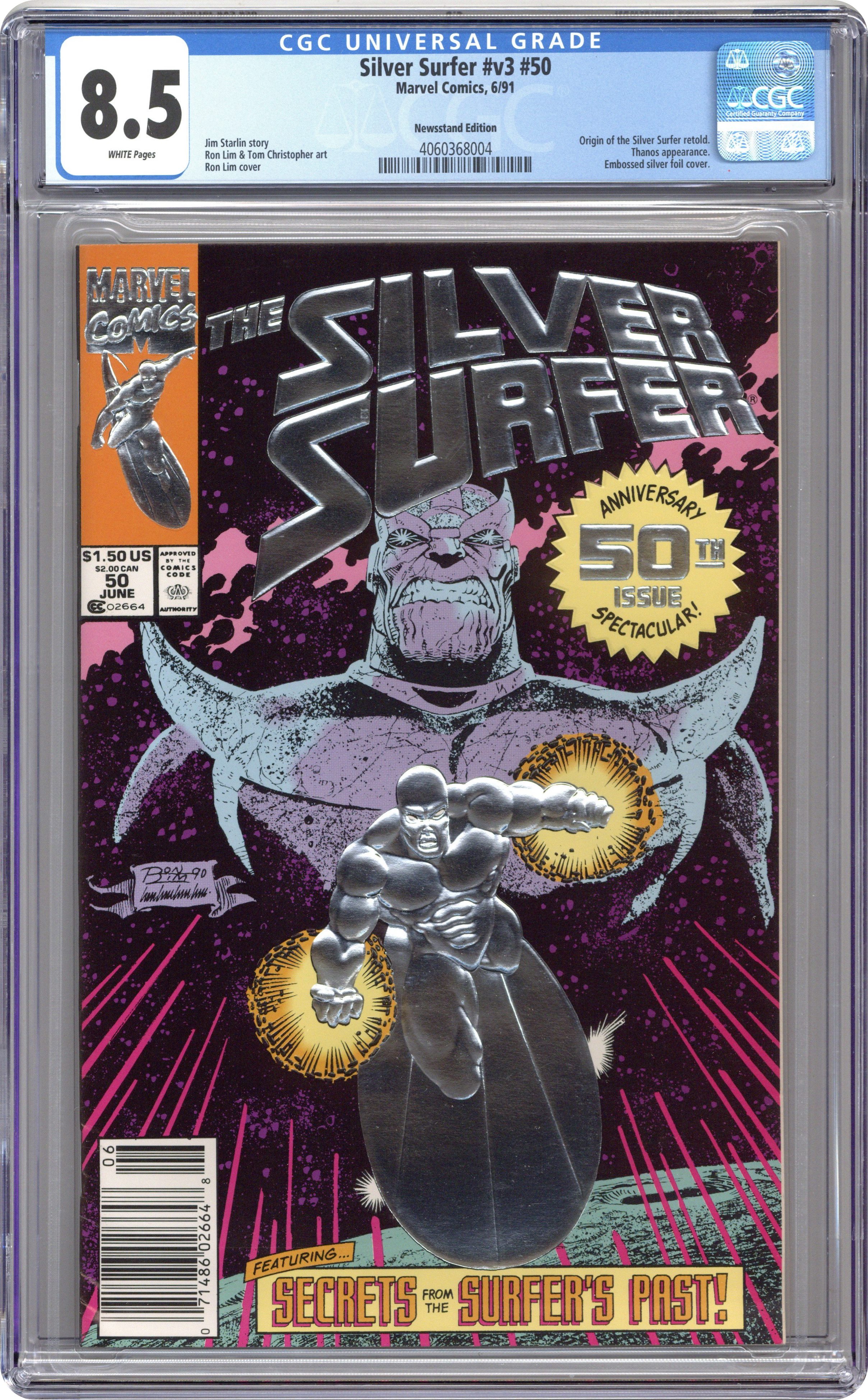 Newstand Edition - 1st printing. Special Anniversary Issue. "Deeply Buried Secrets!" Story by Jim Starlin. Art by Ron Lim and Tom Christopher. In this 50th issue celebration the Silver Surfer fights for his life against a stone golem with all the power and visage of his arch foe Thanos. Plus, learn a dark secret from Norrin Radd's past. By story's end the Surfer plummets toward planet Earth. Broken physically and mentally, will he be able to warn Earth's heroes of the threat Thanos poses to the universe? Story continues in Infinity Gauntlet #1. 48 pages. Cover price $1.50. Grade: CGC 8.5 explanation of grade Condition: Used (collectible)