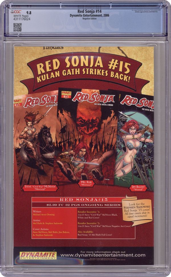 Published Sep 2006 by Dynamite Entertainment.Red Sonja (2005 Dynamite) 14E CGC 9.8 Jones Negative Variant
