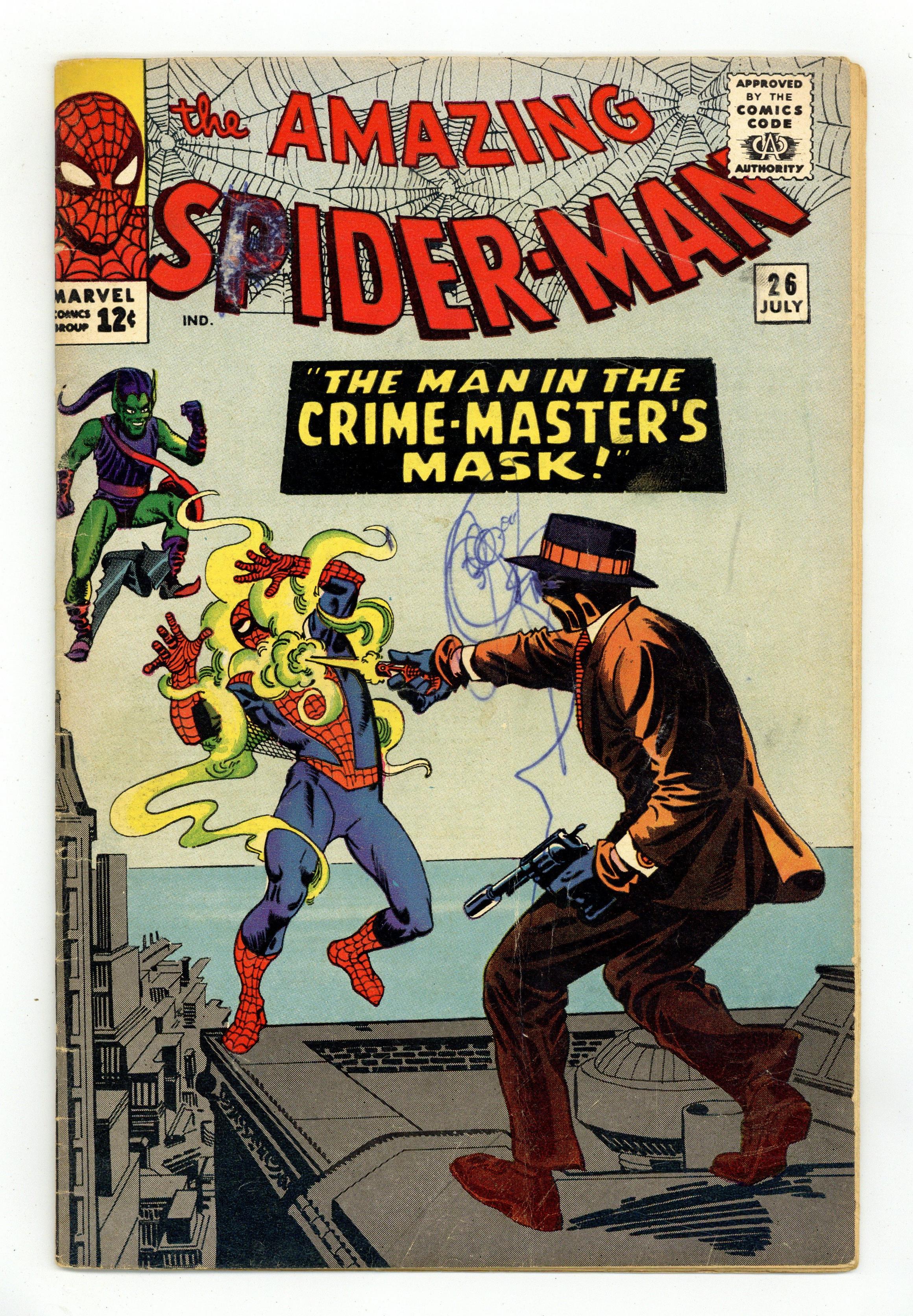Cover art by Steve Ditko. Fourth appearance of the Green Goblin and first appearance of the Crime Master in The Man In The Crime-Master's Mask, script by Steve Ditko (plot) and Stan Lee (script), art by Steve Ditko; Spider-Man battles the Crime-Master and the Green Goblin. Reprinted in Marvel Tales # 21 and 164. Letter to the editor from comics writer Steve Gerber. 36 pgs. $0.12. Cover price $0.12. Grade: GD 2.0 explanation of grade Condition: Used (collectible)
