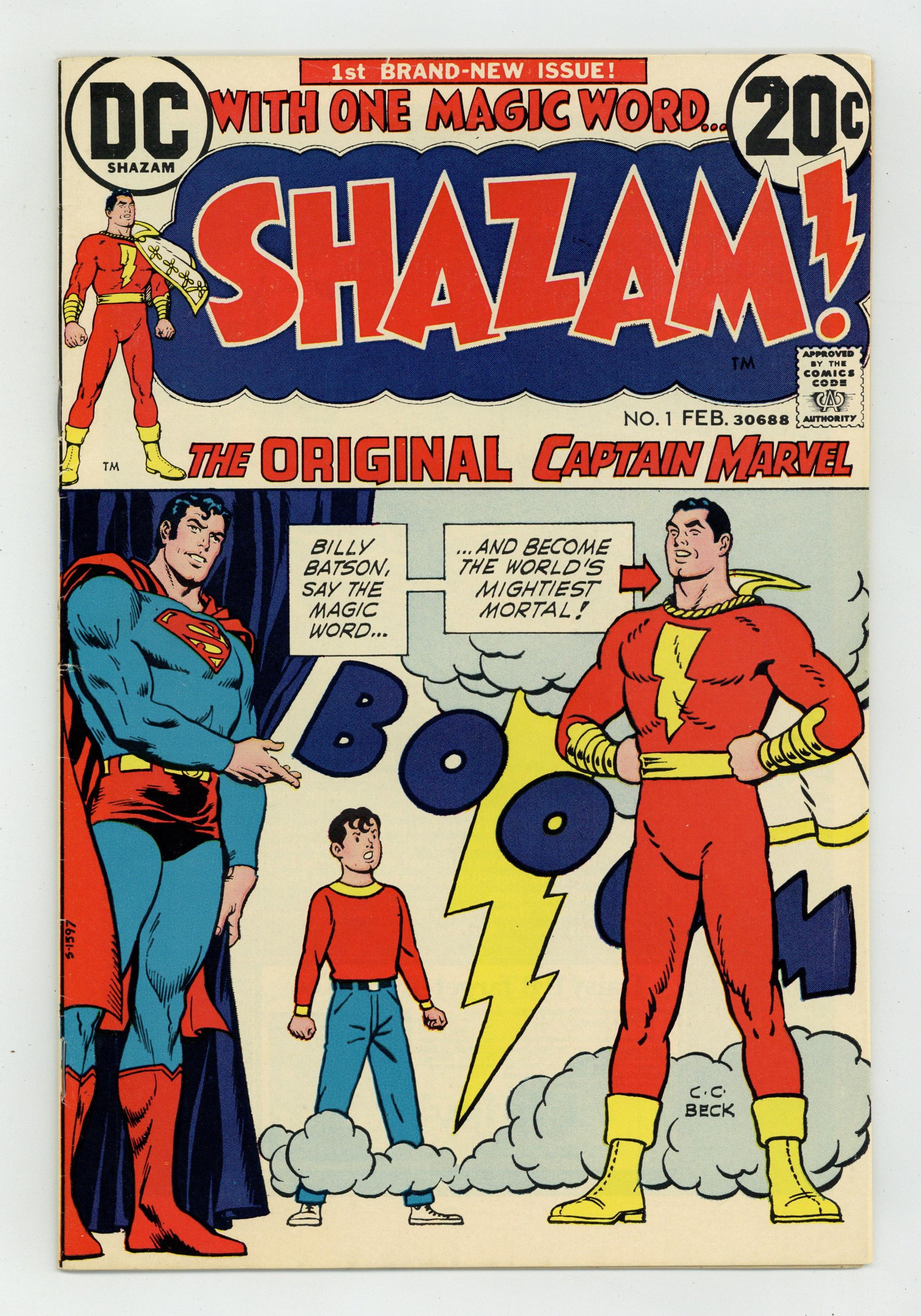 Ended Dec 21 2023 Winning Bid $26 Cover by C. C. Beck, Nick Cardy, and Murphy Anderson. ...In the Beginning ..., script by Denny O'Neil, art by C. C. Beck; After missing for 20 years, Captain Marvel returns to Earth; Origin retold. The World's Wickedest Plan, script by Denny O'Neil, art by C. C. Beck; Captain Marvel escapes the trap that Dr. Sivana had created that caused the Marvel Family to be placed in suspended animation for the last 20 years. Reprint back-up: "The Endless String" (from Captain Marvel Adventures 55 in 1946), written by Otto Binder, art by Pete Costanza. One-page text feature by E. Nelson Bridwell--a history of Captain Marvel. 36 pgs., full color. $0.20. Cover price $0.20. Grade: FN+ 6.5 explanation of grade Condition: Used (collectible)
