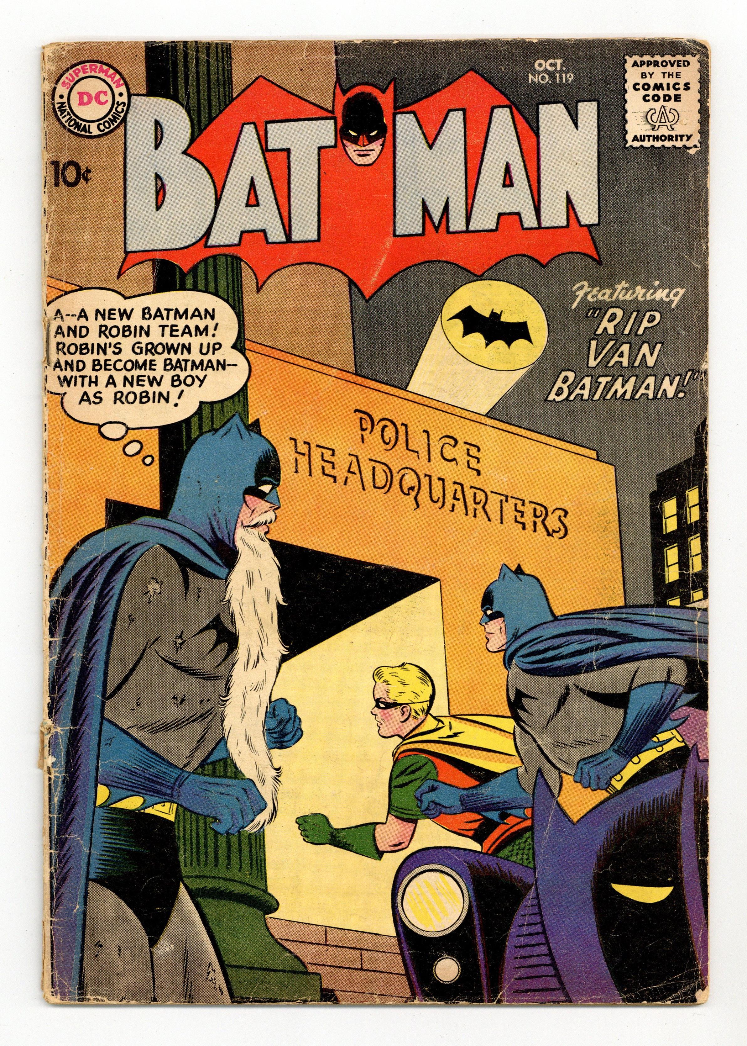 Cover pencils by Curt Swan, inks by Stan Kaye. "The Arch-Rivals of Gotham City," pencils by Sheldon Moldoff, inks by Stan Kaye; The "Woman of the Year" contest has two finalists: Vicki and Batwoman, and the judges decide to give both ladies a chance to prove their abilities before they select a winner...a winner who gets a date with the Batman! Lost -- A Free Education public service announcement with Binky, art by Bob Oksner. "The Secret of Batman Island," script by Bill Finger, pencils by Sheldon Moldoff (as Bob Kane), inks by Charles Paris; The founder/owner of Batman Island is followed home by criminals seeking films the man has been shooting that could finger them for a crime they committed. Half-page "Humorous Sheriff!" story. One-page Jail Jests story by Henry Boltinoff. "Fatal Incident" text story. "Rip Van Batman," script by Bill Finger, pencils by Sheldon Moldoff (as Bob Kane), inks by Charles Paris; Looking for criminal Al Hackett, Batman enters a greenhouse with exotic flowers and accidently trips over a vine, smashing into a case with a flower that gives off a strange vapor, and he passes out. One-page Casey the Cop story by Henry Boltinoff. 36 Pages, Full Color. Cover price $0.10. Grade: GD/VG 3.0 explanation of grade Condition: Used (collectible)