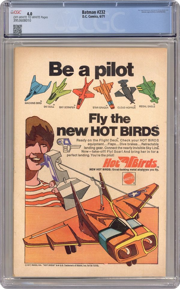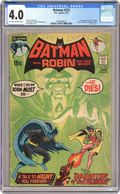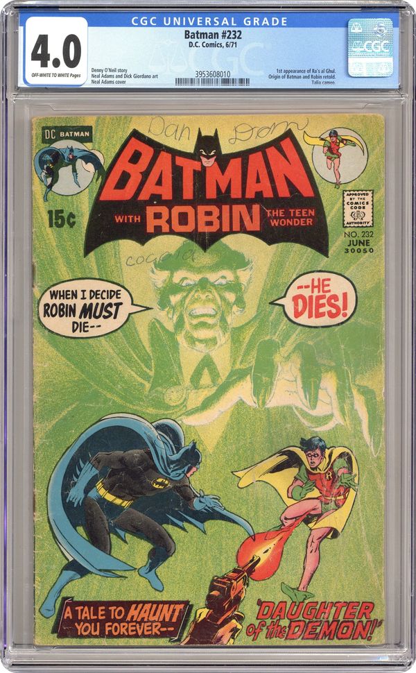 1st appearance of Ra's Al Ghul. Last 15-cent cover price. Cover by Neal Adams. "Daughter of the Demon," script by Denny O'Neil, pencils by Neal Adams, inks by Dick Giordano; Origin of Batman and Robin retold; Robin returns home from a night of adventuring; Two gunmen armed with tranquilizer darts shoot the Boy Wonder and take him prisoner; Later, Bruce Wayne receives a photograph of his kidnapped partner and a challenge to find him; Ra's Al Ghul contacts deduce that Bruce Wayne and the Batman are one in the same; He calls upon the world's greatest detective to help him find his daughter Talia, who also has been kidnapped. Letter to the editor by Mike W. Barr. 36 Pages, Full Color. Cover price $0.15. Grade: CGC 4.0 explanation of grade Condition: Used (collectible)