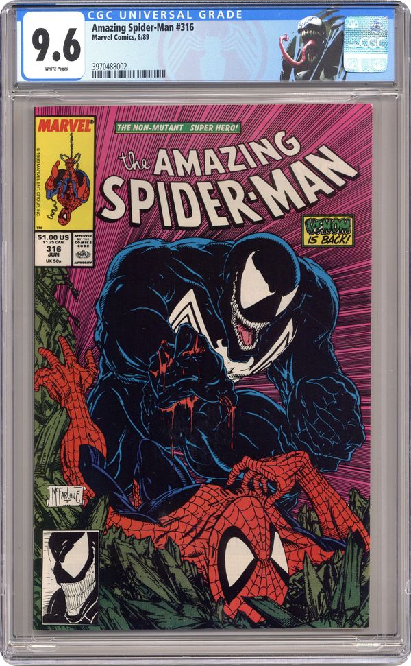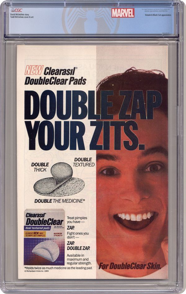 Direct Edition. "Dead Meat" Part 1 of 2. Script by David Michelinie. Art by Todd McFarlane. Cover by Todd McFarlane. Venom is back in New York City! And the deranged Eddie Brock is looking to kill Peter Parker or Spider-Man with extreme prejudice! However, first the psychotic symbiote has to find where the Parkers are living! At the web-slinger's former Bedford Towers residence, Venom runs into and then runs roughshod over the Black Cat! But Felicia doesn't know where the wall-crawler is either! Later on Peter learns that his worst nightmare has returned and his family is in grave danger. Spider-Man can't wait for Venom to make the first move. The web-slinger must attack! Cameo appearances by Aunt May, Glory Grant, and Eduardo Lobo. (Note: This two-part story was reprinted in 1990 in the trade paperback: Spider-Man vs. Venom.) 36 pages. Cover price $1.00. Grade: CGC 9.6 explanation of grade Condition: Used (collectible)