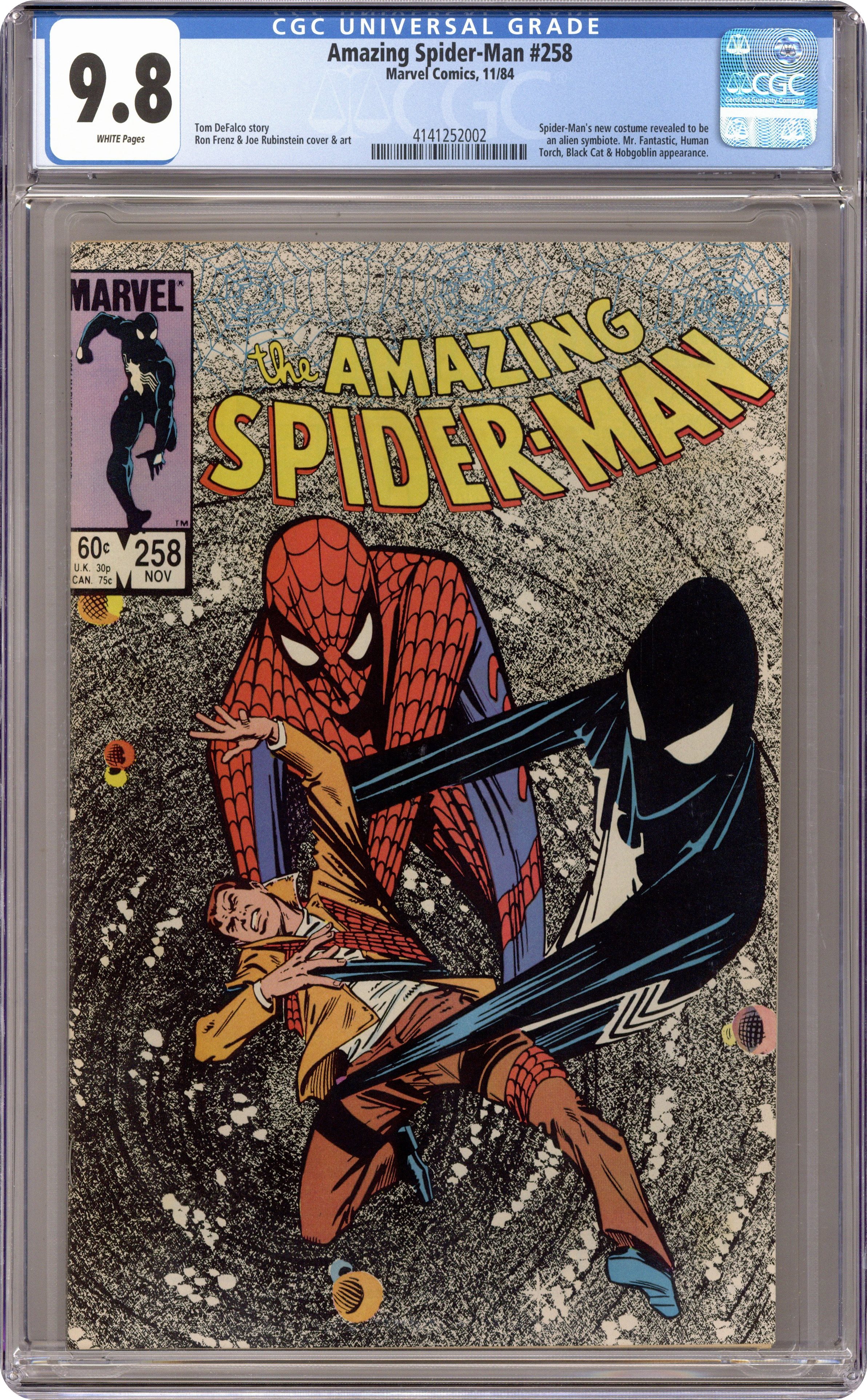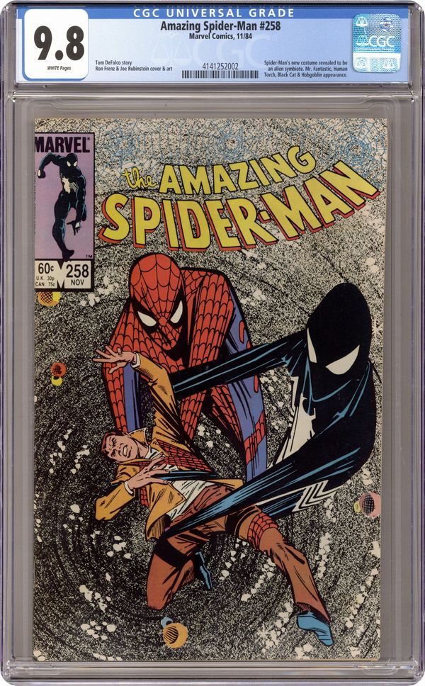 Ended Feb 13 2024 Winning Bid $160 Direct Edition. "The Sinister Secret of Spider-Man's New Costume!" Guest-starring Mr. Fantastic and the Human Torch. Script by Tom DeFalco. Pencils by Ron Frenz. Inks by Joe Rubinstein. Cover by Ron Frenz and Joe Rubinstein. Chaos erupts at 410 Chelsea when Mary Jane Watson and the Black Cat meet inside Peter Parker's apartment! Wow, what a shocking development! To say that the web-slinger has some explaining to do...would be the understatement of the year! After the dust settles, the wall-crawler swings over to the Baxter Building to let Reed Richards analyze his new black costume. When Spider-Man learns his costume is "alive," he tries to pull it off; but the alien symbiote has other ideas! Can the Fantastic Four help Spidey with his major wardrobe malfunction? Cameo appearances by the Rose, Hobgoblin, and Puma. (Notes: The Black Cat and Mary Jane Watson are formally introduced to one another in Spectacular Spider-Man 123. The cover does not display the typical UPC box in the lower left-hand corner. This issue was reprinted in Marvel Tales 272.) 36 pages. Cover price $0.60. Grade: CGC 9.8 explanation of grade Condition: Used (collectible)